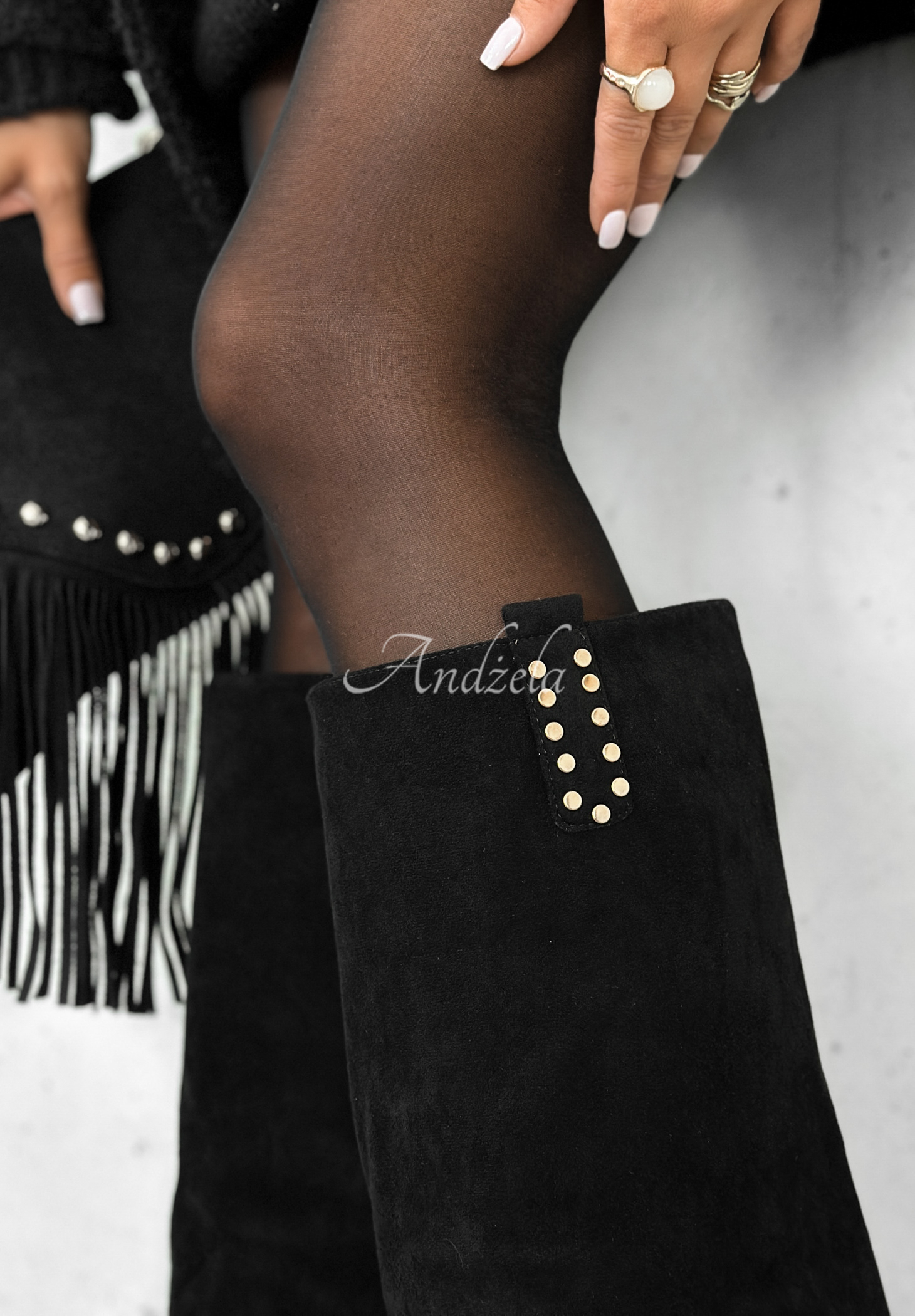 Cizme lungi din imitație de piele întoarsă, așezate pe toc gros înalt. Model cu închidere cu fermoar pe partea interioară și strat suplimentar de material în exterior. Produsul se remarcă prin detalii decorative aurii.