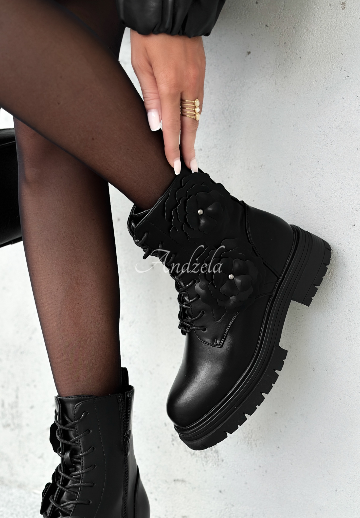 Botine din imitație de piele, pe talpă înălțată, cu ușoară căptușeală. Modelul este decorat cu flori, are șireturi și închidere cu fermoar.