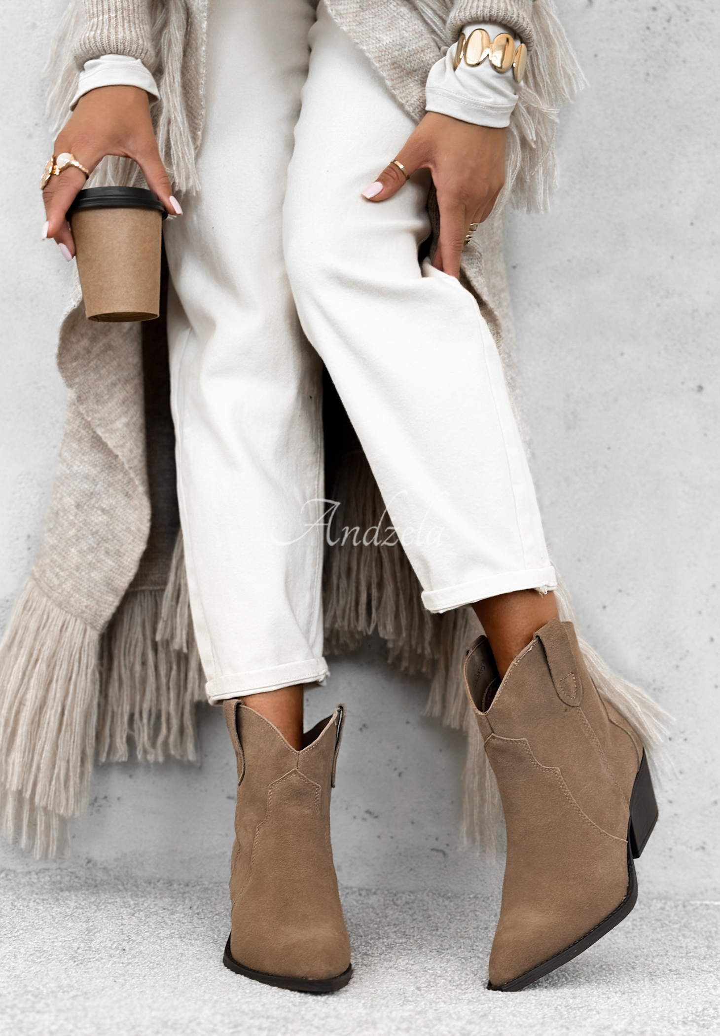 Botine cowboy confecționate din piele întoarsă naturală. Model cu vârf ascuțit, așezat pe toc oblic. Este ușor căptușit și nu are închidere.