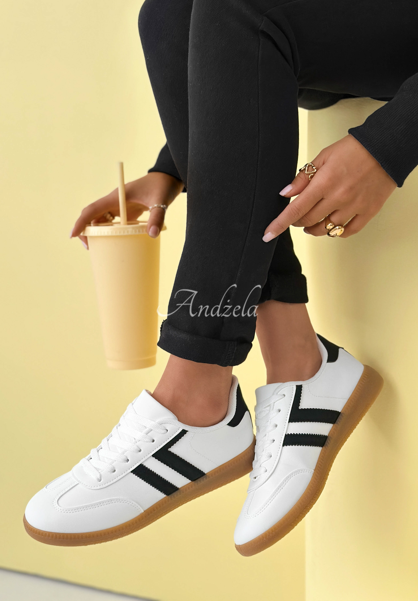 Adidași cu vârf rotunjit, așezați pe talpă din cauciuc. Este un model cu șireturi, cu partea superioară sub gleznă, prevăzut cu inserții din imitație de piele.