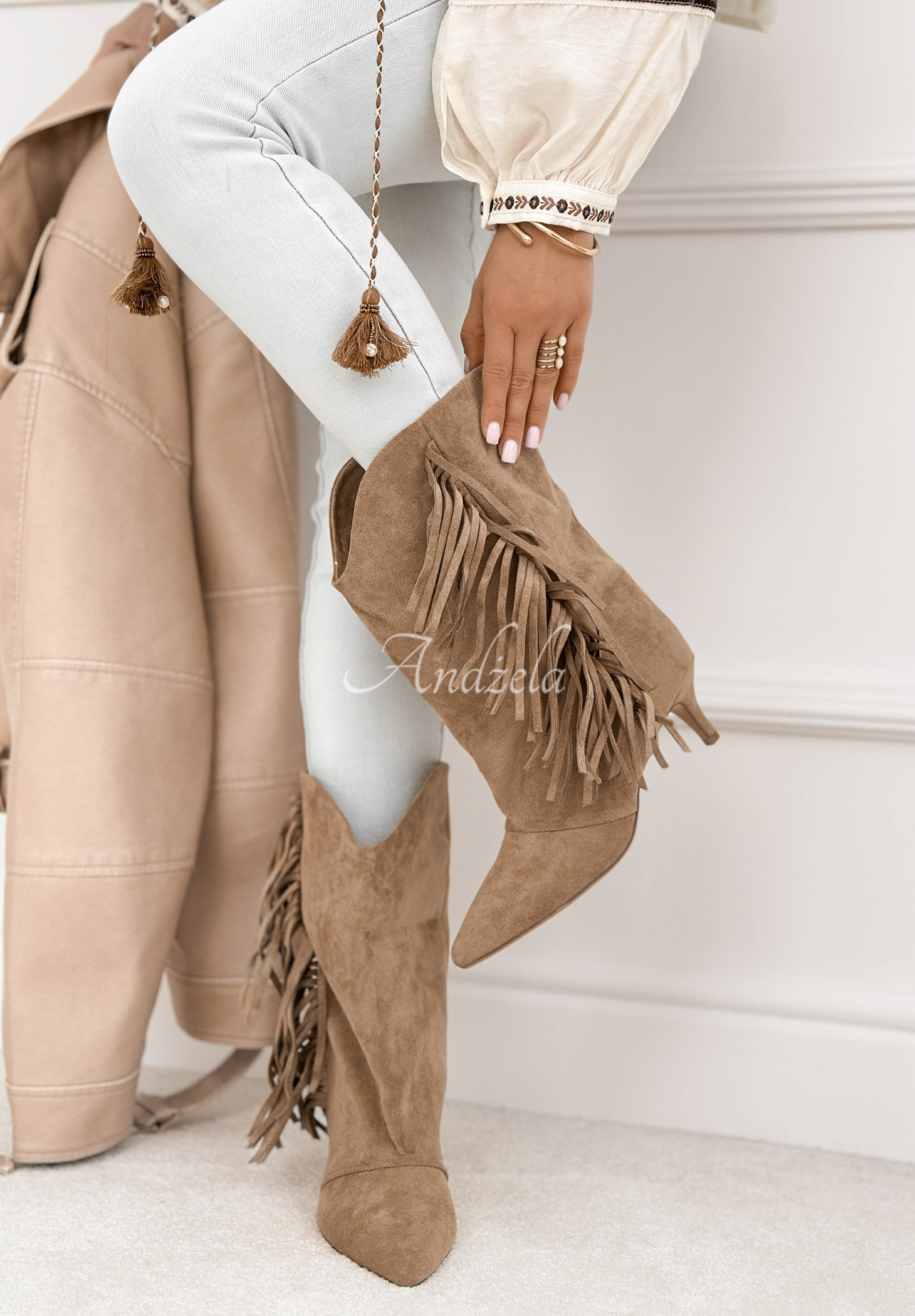 Botine din piele întoarsă, cu toc subțire mai jos, decorate cu franjuri. Este un model fără închidere, cu vârf ascuțit și căptușeală ușoară.