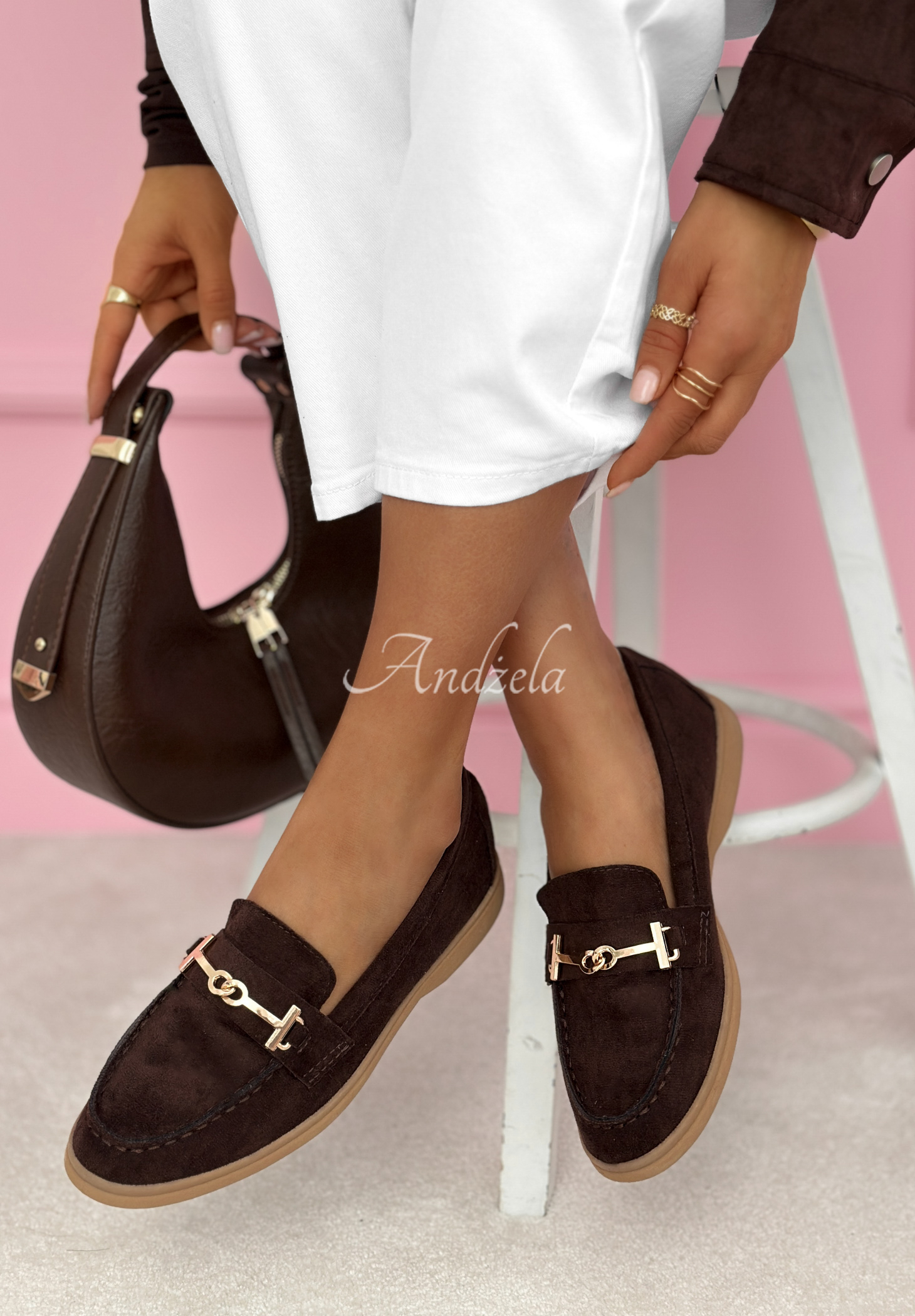 Mocasini din piele întoarsă, așezați pe o talpă plată din cauciuc. Model cu vârf rotunjit, care se remarcă prin detaliul auriu din partea din față.
