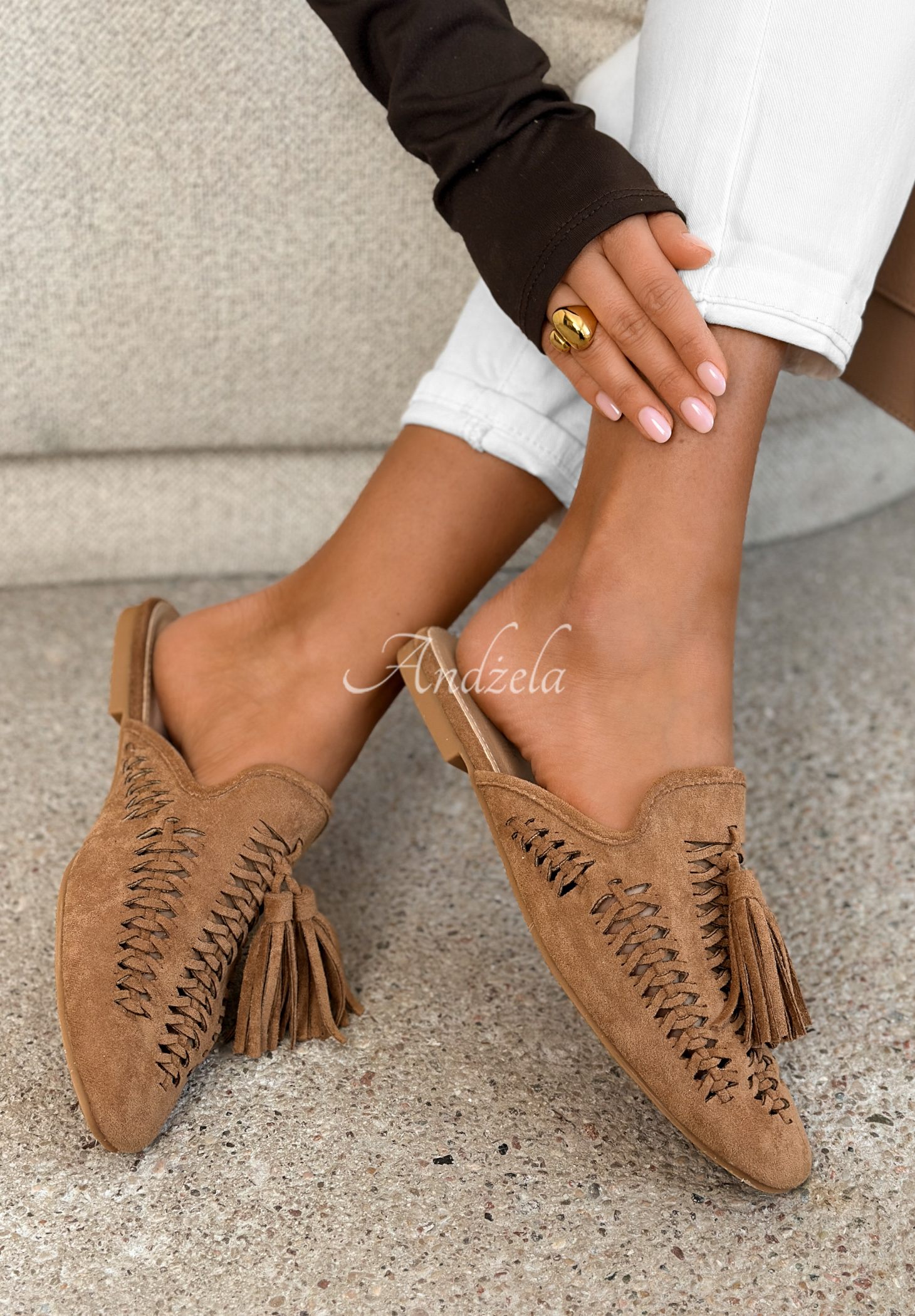Șlapi mocasini așezați pe o talpă plată din cauciuc, realizați din material din piele întoarsă. Este un model care se remarcă prin imprimeurile împletite, ajurate, precum și prin franjurii decorativi în partea de sus.