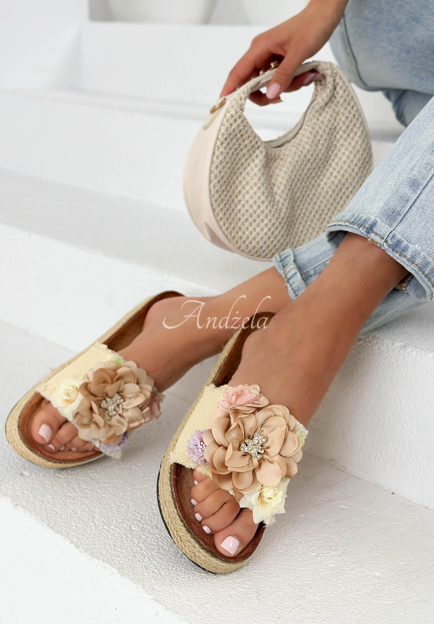 Șlapi cu vârf rotunjit, așezați pe talpă înaltă. Modelul se remarcă prin florile decorative și detaliul auriu.* talpă înaltă* vârf rotunjit* flori decorative* detaliu auriu