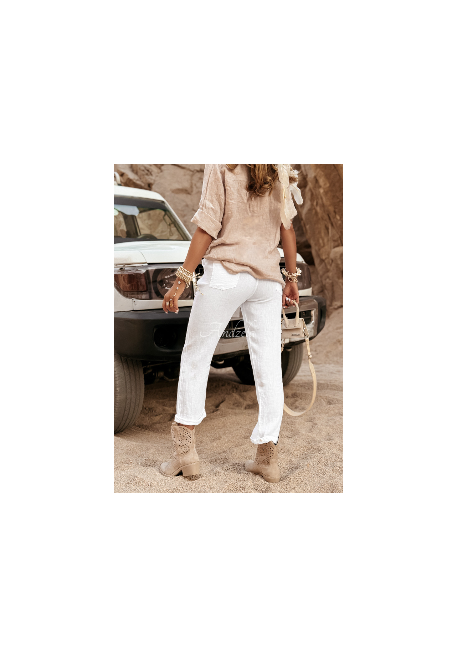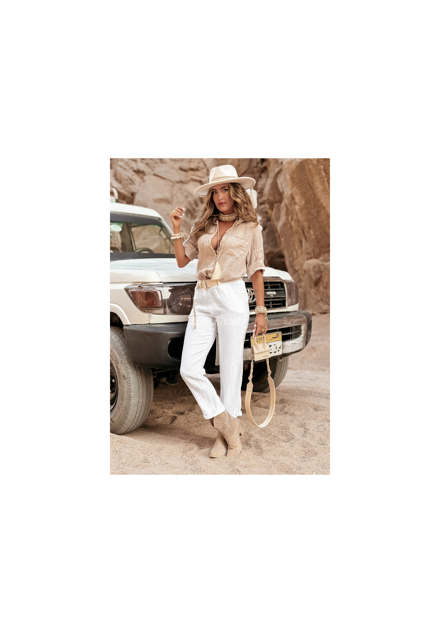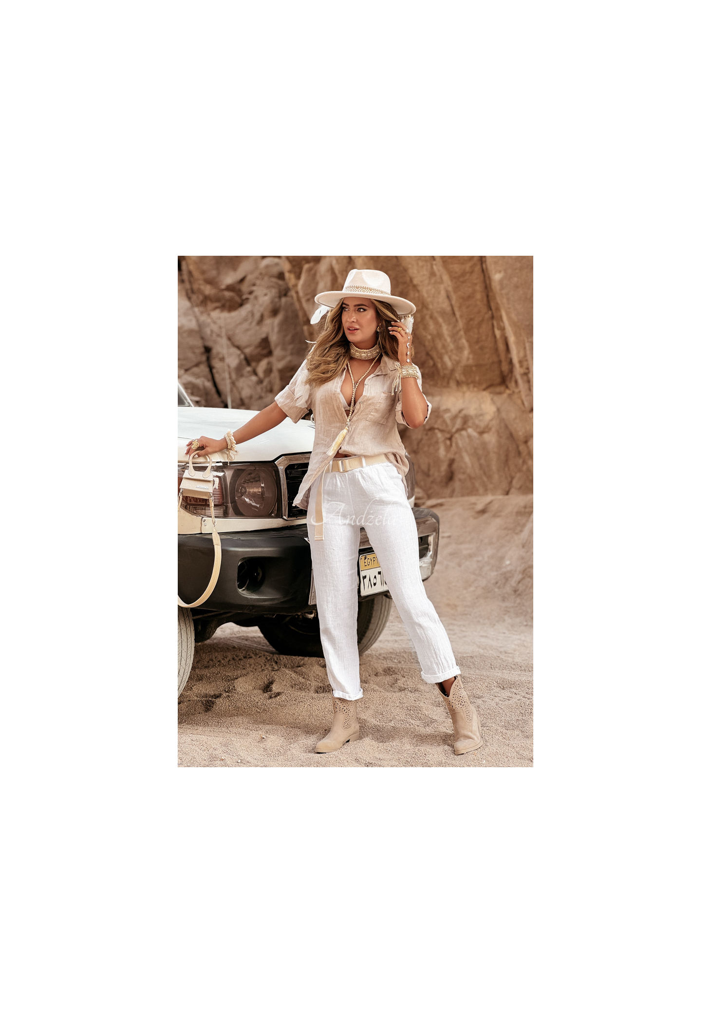 Pantalonii din material de in de înaltă calitate sunt o alegere excelentă în sezonul de vară. Au bandă elastică cusută la talie, datorită căreia se potrivesc perfect siluetei, iar un avantaj suplimentar este cureaua inclusă în set, care conferă întregului caracter. Au buzunare funcționale în față și la spate. Pantaloni din seria Take A Trip, alege dintre alte produse disponibile și creează look-ul perfect.