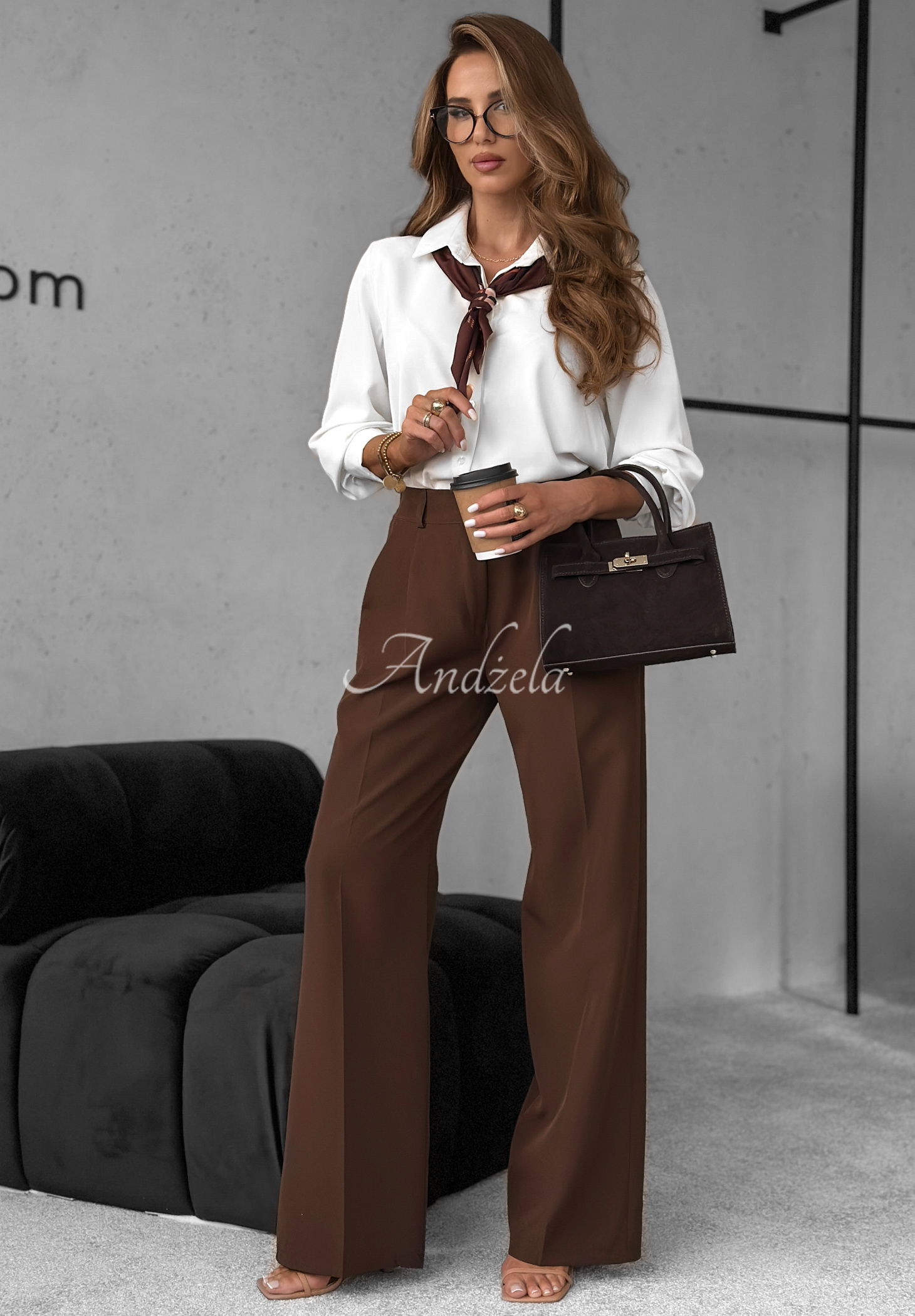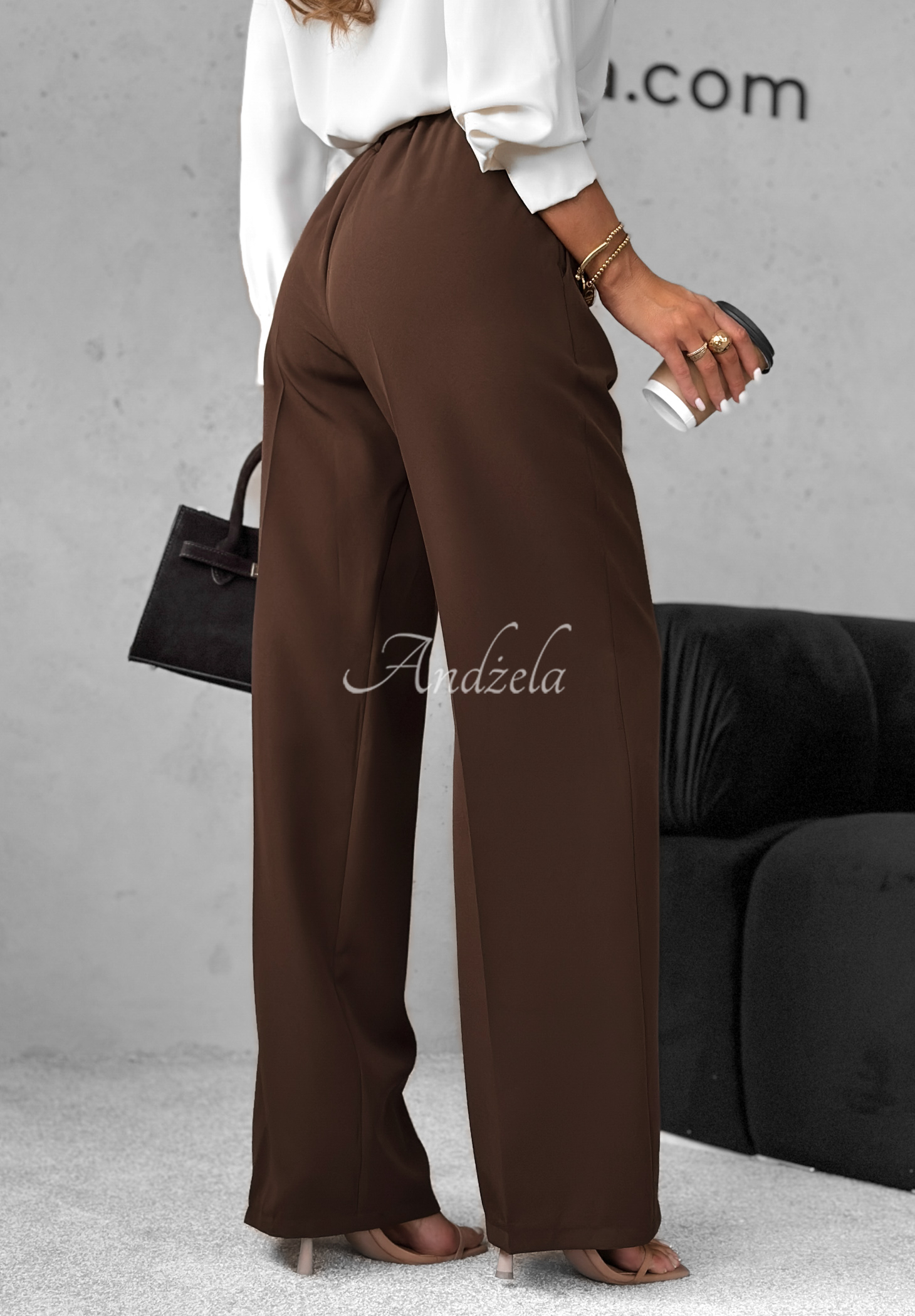 Pantaloni din material ușor, cu croială wide leg. Model cu talie înaltă și picioare late, cu dungă centrală. Se închid cu fermoar și nasture, având bandă elastică în talie. În față dispun de buzunare funcționale.
