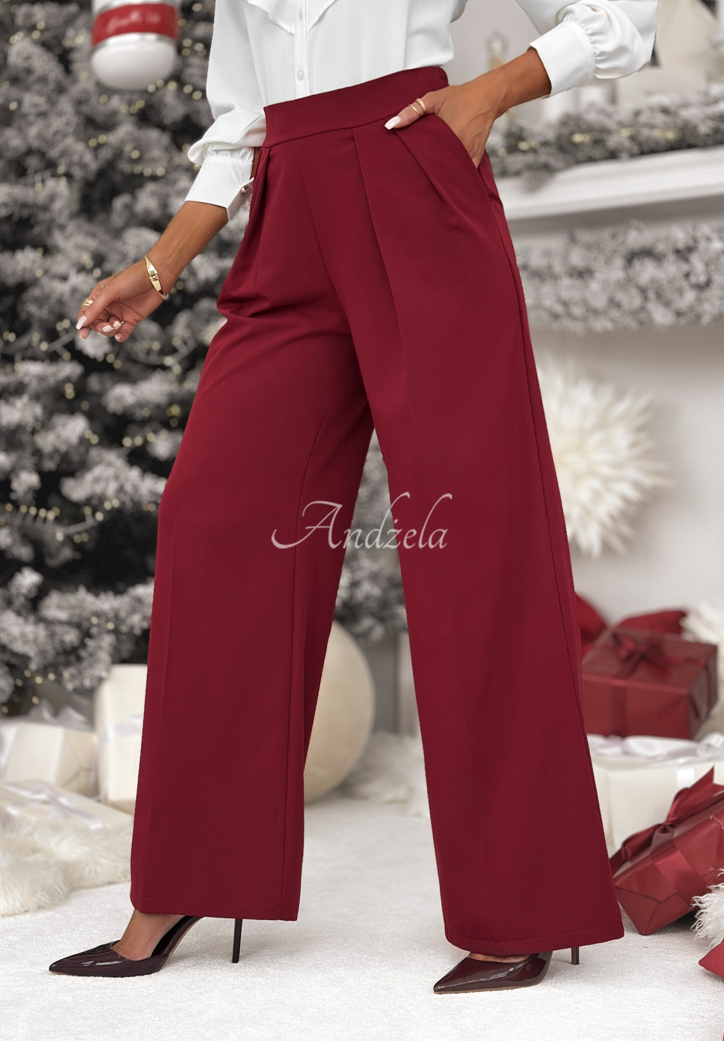 Pantaloni eleganți, realizați din material neelastic cu adaos de viscoză. Este un model cu crac larg și pliuri. Au elastic în partea din spate a taliei. Model cu talie înaltă și buzunare funcționale în față.