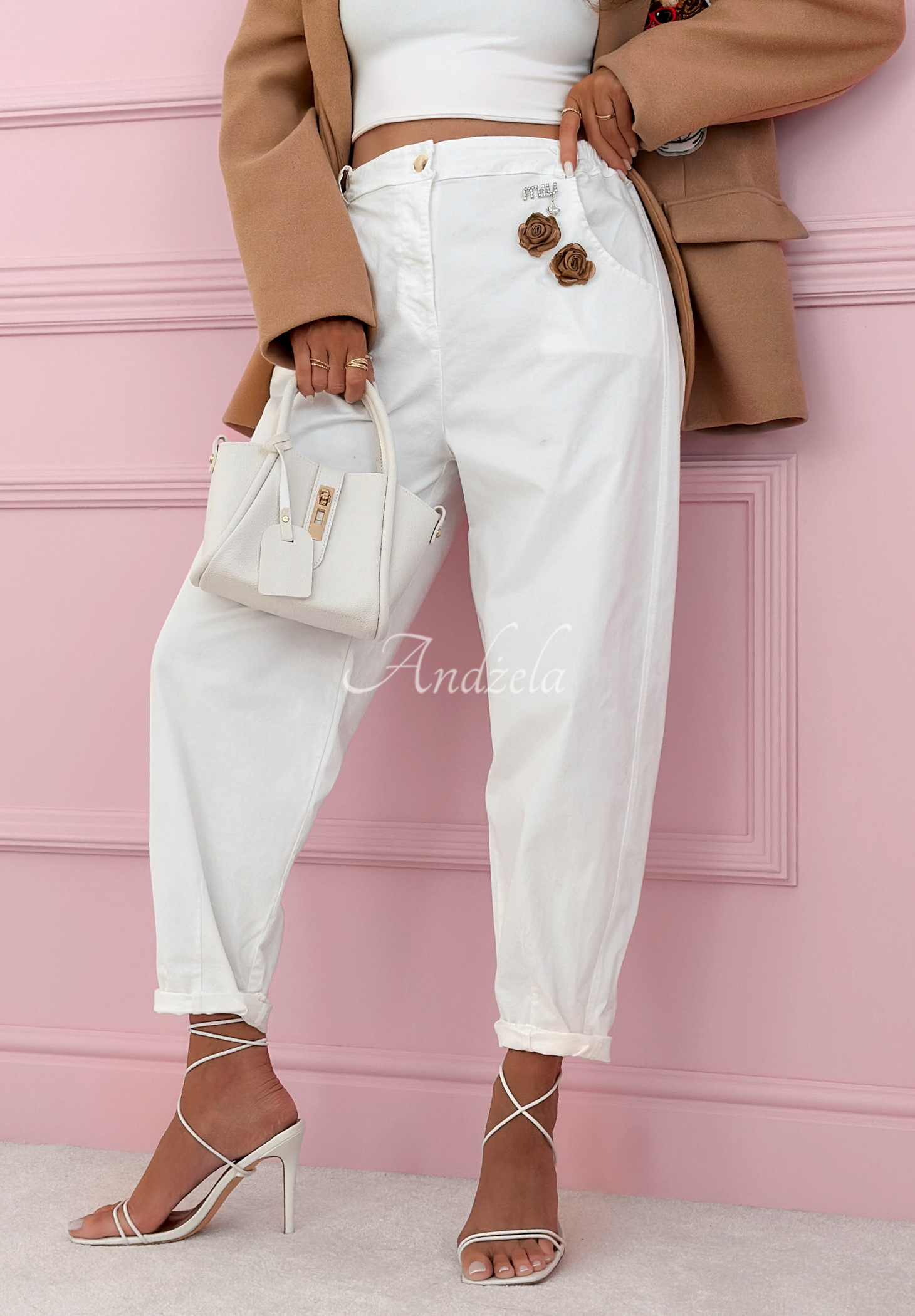 Blugi balloon realizați din material elastic. Este un model cu talie înaltă și bandă elastică în talie, în partea din spate. Atât în partea din față, cât și în partea din spate au buzunare funcționale. Setul include broșe decorative.