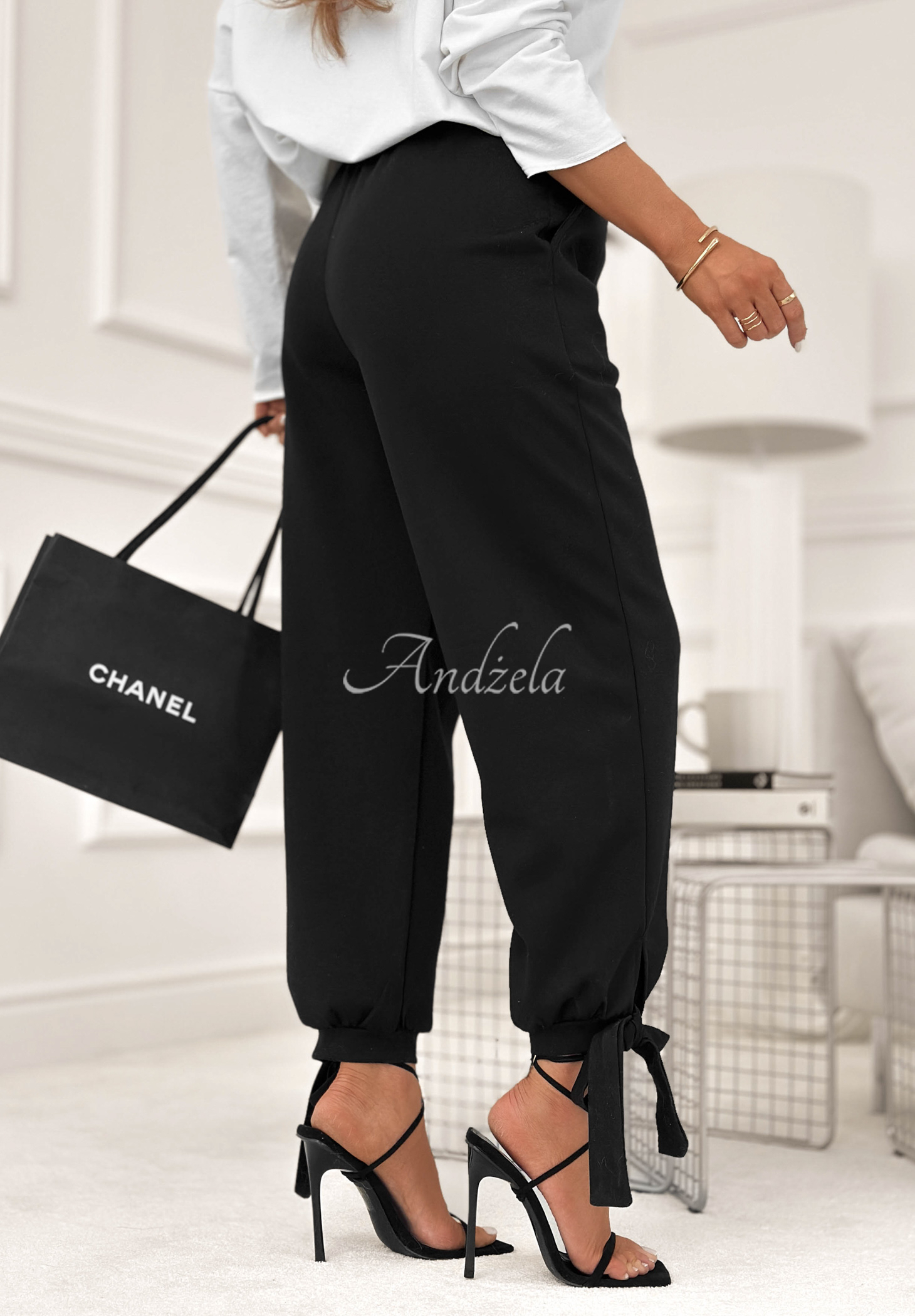 Pantaloni de trening moi, realizați din material neted și lejer din viscoză. Model cu croială clasică, cu elastic cu șnur reglabil în talie și buzunare în partea din față. Cracii lungi sunt finisați cu legături reglabile în formă de fundiță.
