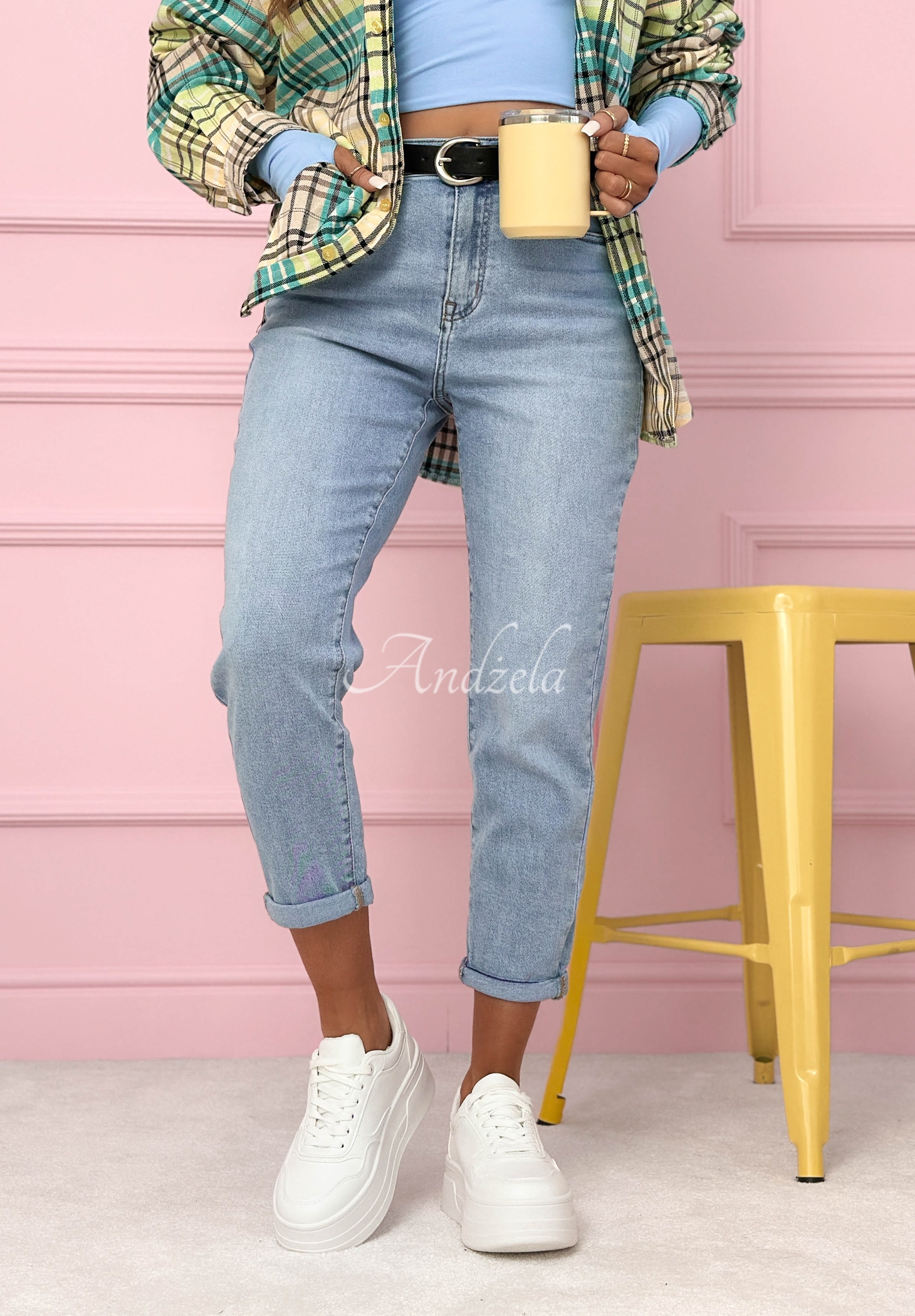 Blugi mom fit, realizați din material elastic. Este un model cu talie înaltă, cu închidere cu fermoar și nasture. Atât în partea din față, cât și la spate se află buzunare funcționale. Setul include o curea cu accesoriu decorativ.