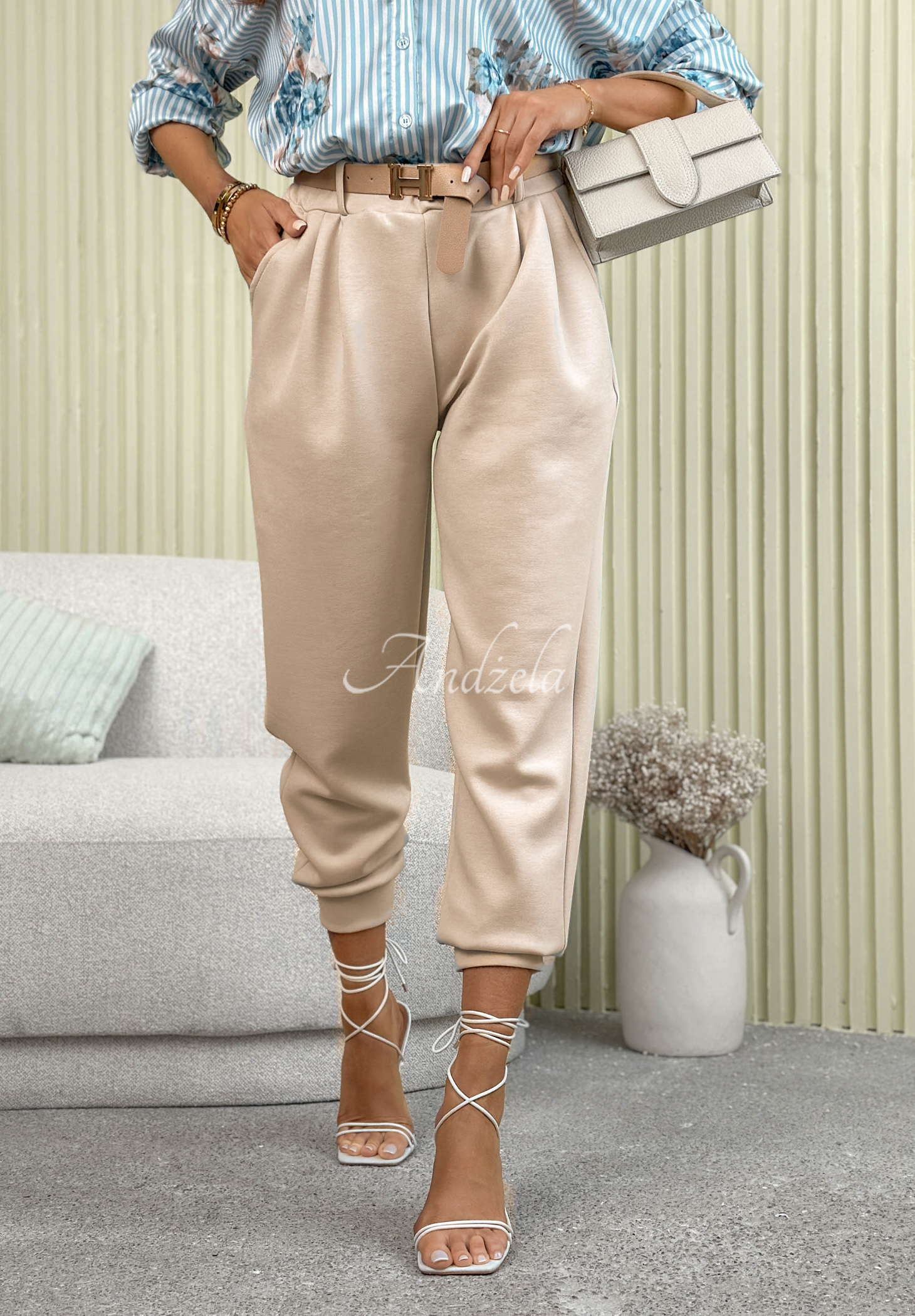 Pantaloni din viscoză, confecționați din material extrem de plăcut la atingere, cu aspect lejer. Model cu talie înaltă și manșete în partea de jos. În partea din spate a taliei se află elastic, iar în partea din față buzunare funcționale. Setul include o curea.