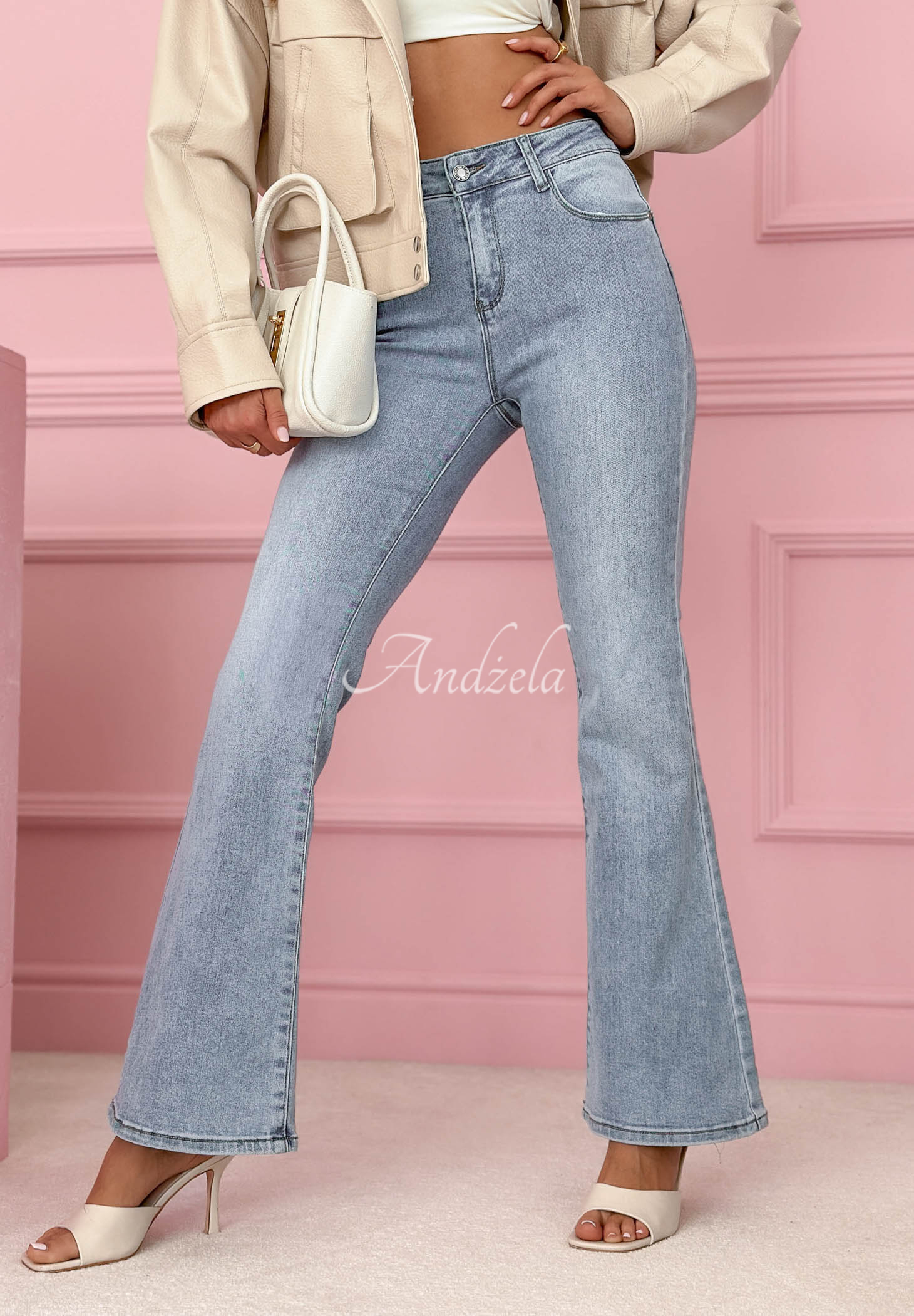 Blugi cu croială evazată, confecționați din material elastic. Este un model cu talie medie, cu închidere cu fermoar și nasture. Atât în partea din față, cât și în partea din spate se află buzunare funcționale.
