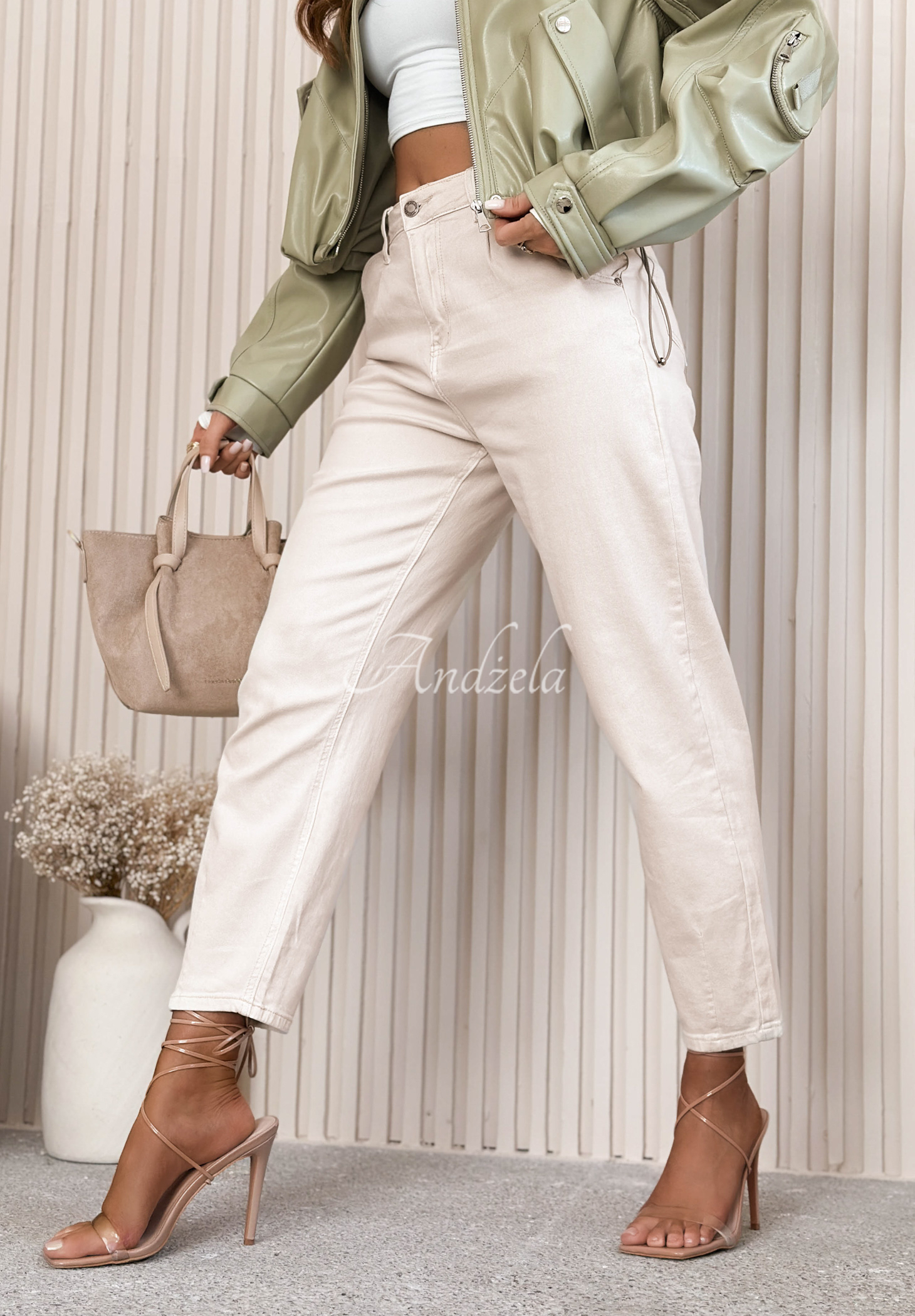 Blugi balloon realizați din material elastic. Model cu talie înaltă și buzunare funcționale.