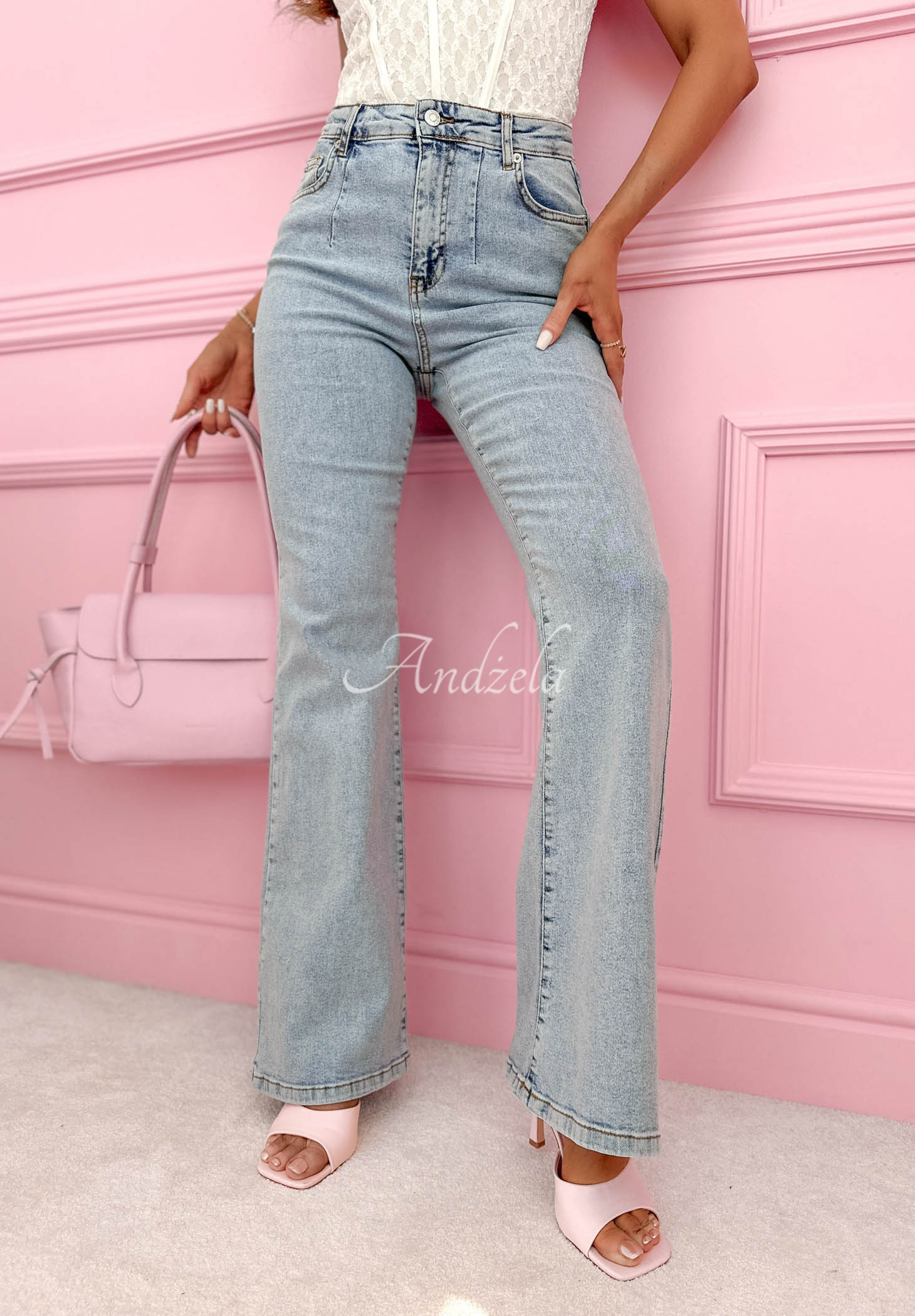 Blugi cu croială evazată, confecționați din material ușor elastic. Este un model cu talie mai înaltă, cu închidere cu fermoar și nasture. În partea din față se află buzunare funcționale.