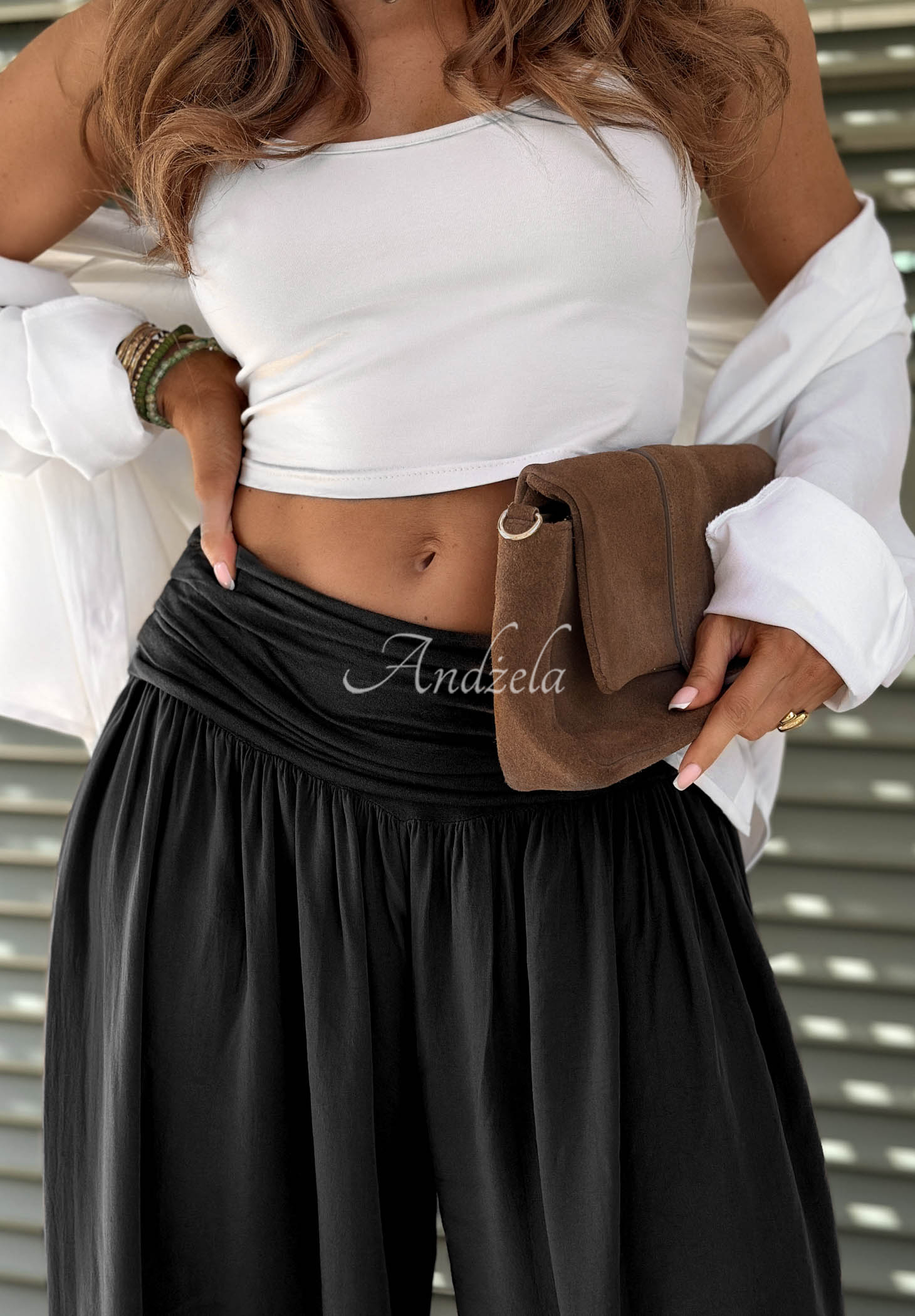 Pantaloni aerisiți cu croială lejeră tip harem. Model cu bandă elastică la terminația cracilor, realizat din material din viscoză de calitate. Este o propunere cu bandă elastică în talie și talie lată, fronseată.