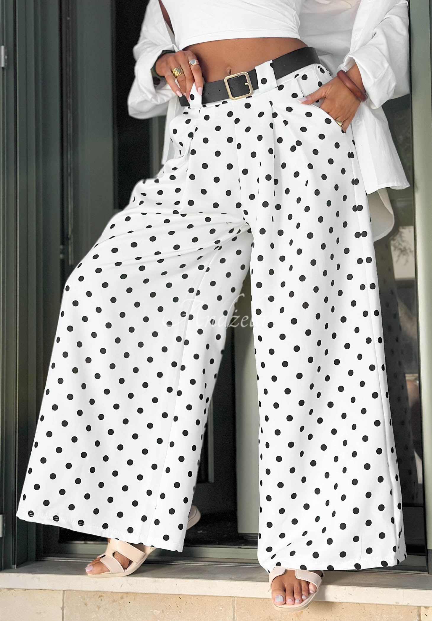 Pantaloni din material wide leg cu buline. Este un model cu talie înaltă, cu bandă elastică în talie în partea din spate și buzunare funcționale. În set este inclusă o curea cu cataramă aurie.