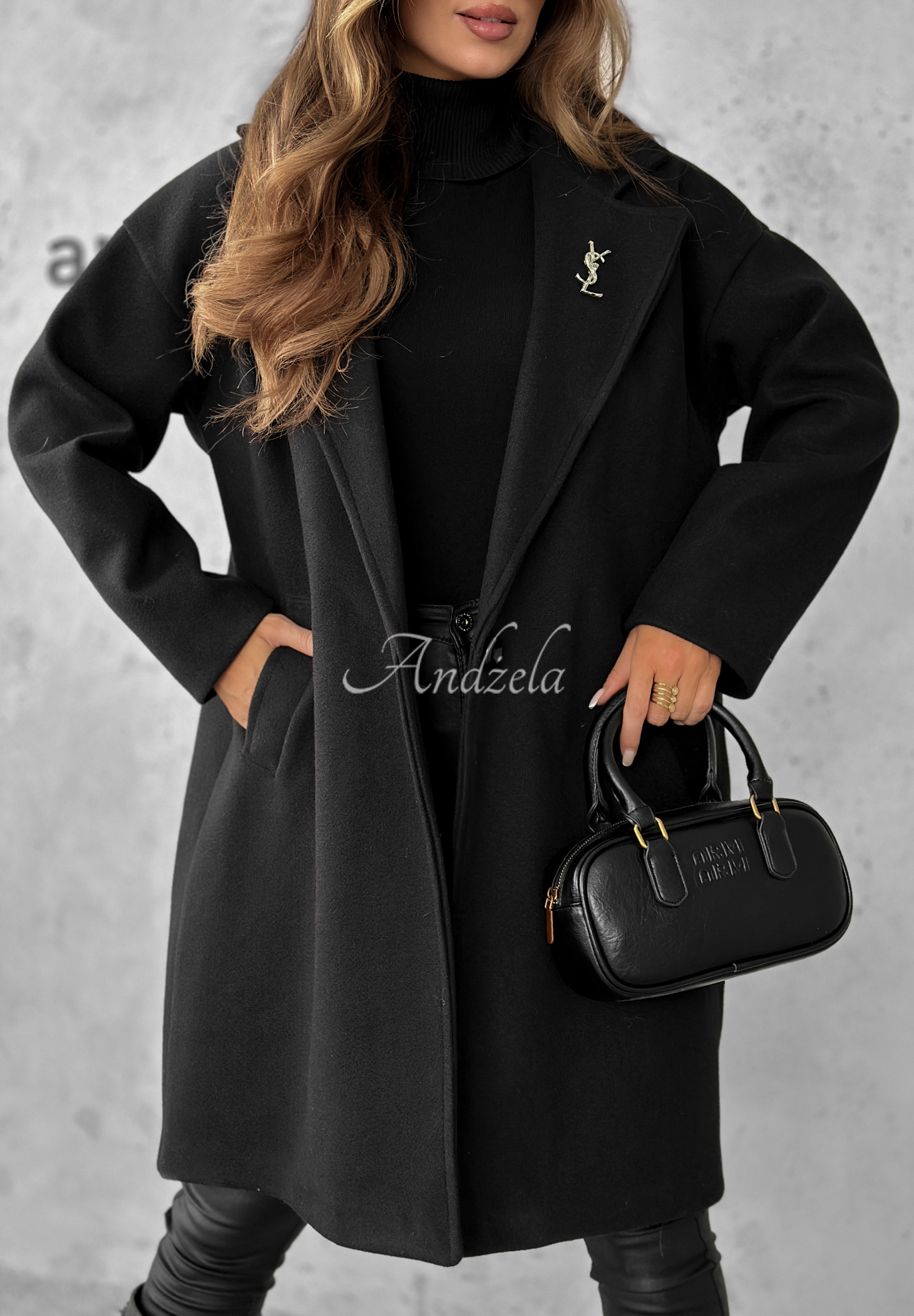 Pardesiu clasic, cu croială lungă și guler. Model prevăzut cu închidere cu un singur nasture, căptușeală și mâneci lungi. În partea din față are buzunare funcționale, iar setul este completat de o broșă decorativă.