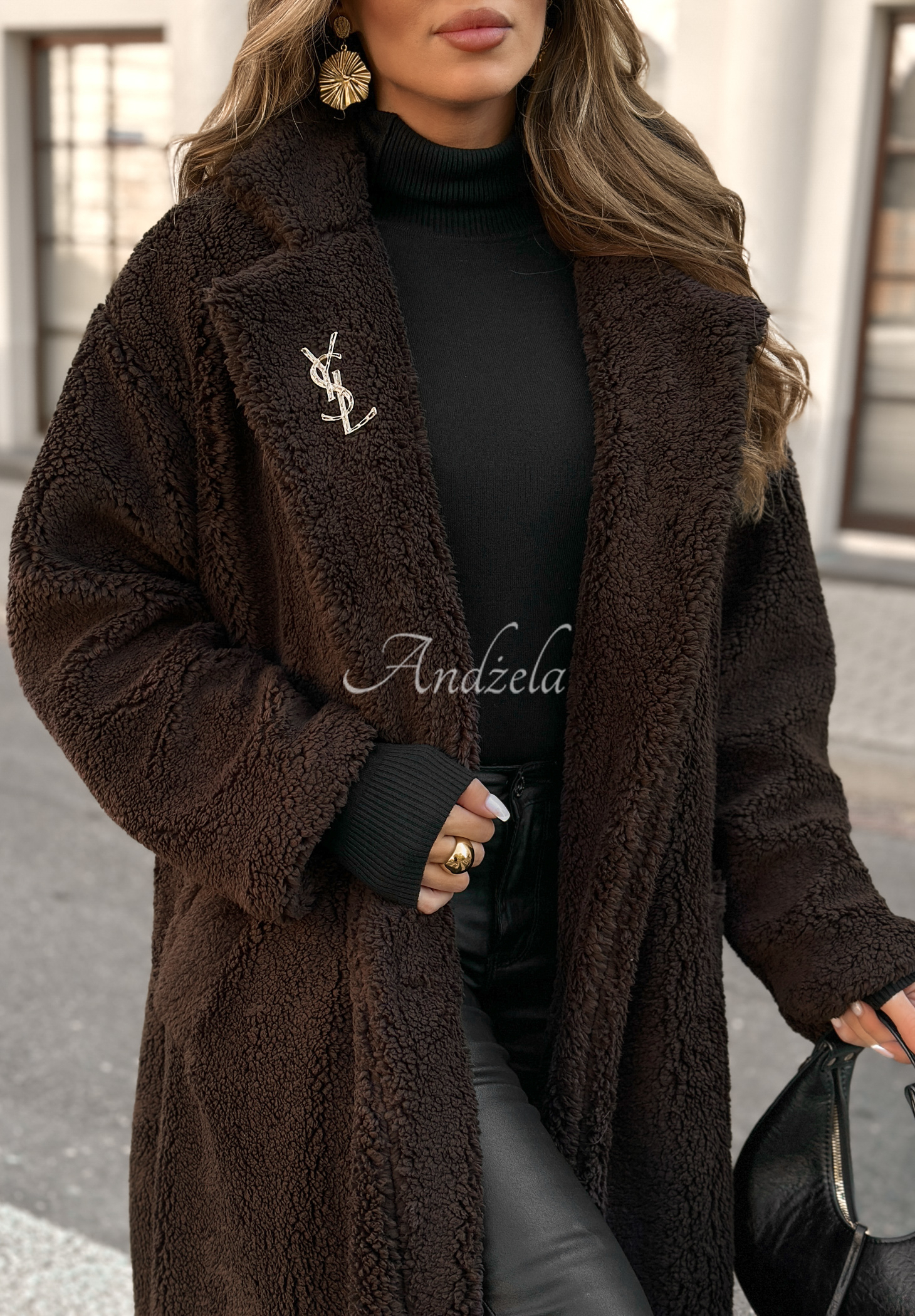 Pardesiu lung confecționat din imitație de lână de miel, o propunere creată pentru sezonul de tranziție. Model cu guler și mâneci lungi. Se încheie cu un rând de nasturi și dispune de buzunare funcționale în față.