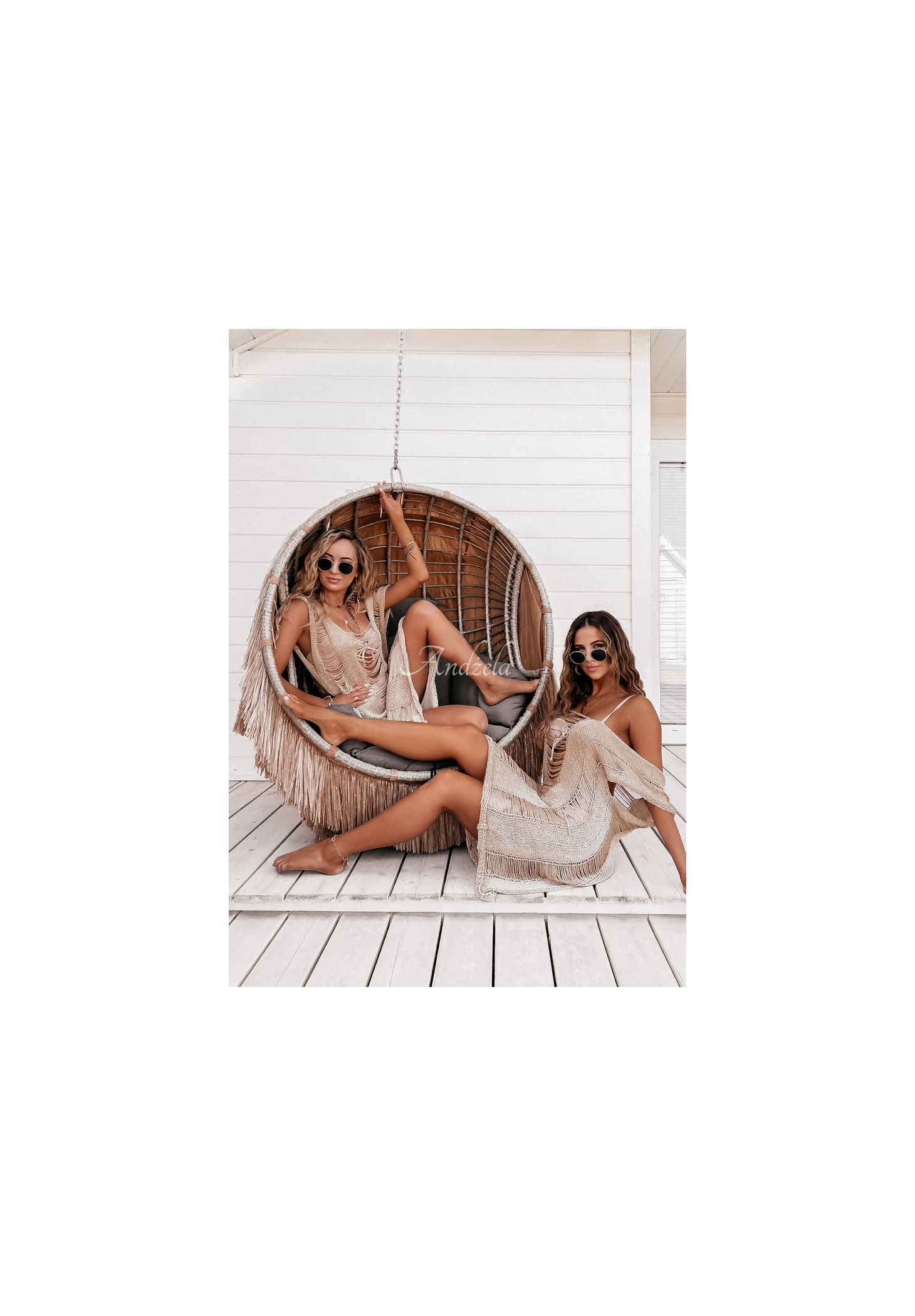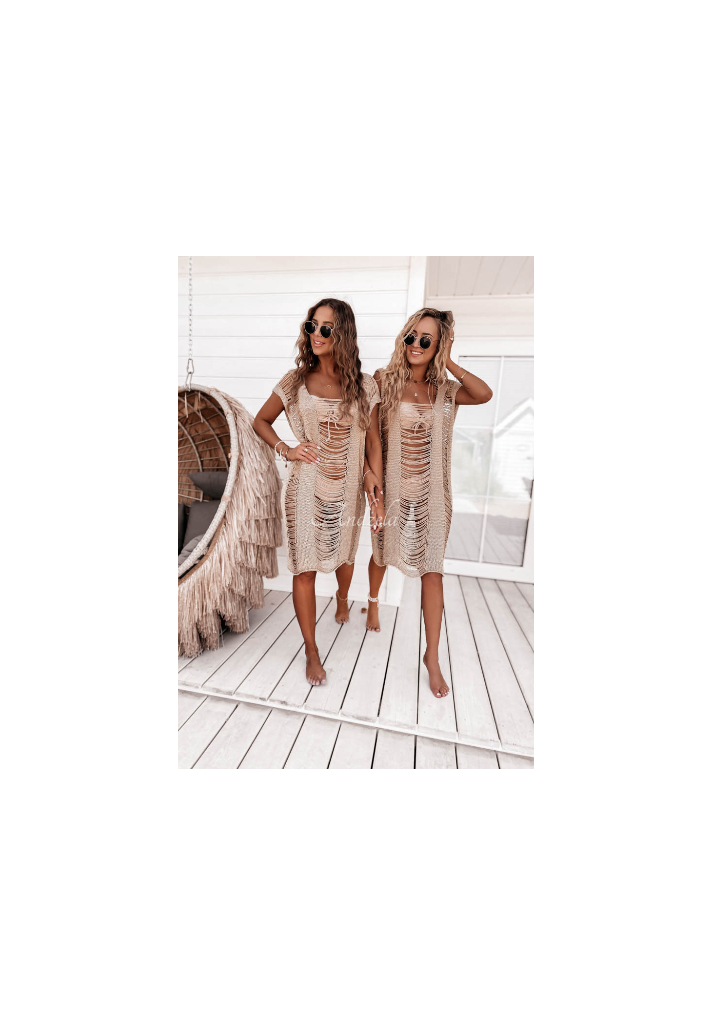 Pareo-ul tricotat foarte impresionant, cu cusături de fir auriu este o propunere perfectă pentru vară. Se distinge prin conexiuni de material decorativ, realizate din multe sfori delicate. Va arăta absolut feminin și senzual și va da caracter multor ținute de plajă. Acest model ar trebui să fie în fiecare garderobă de vară.