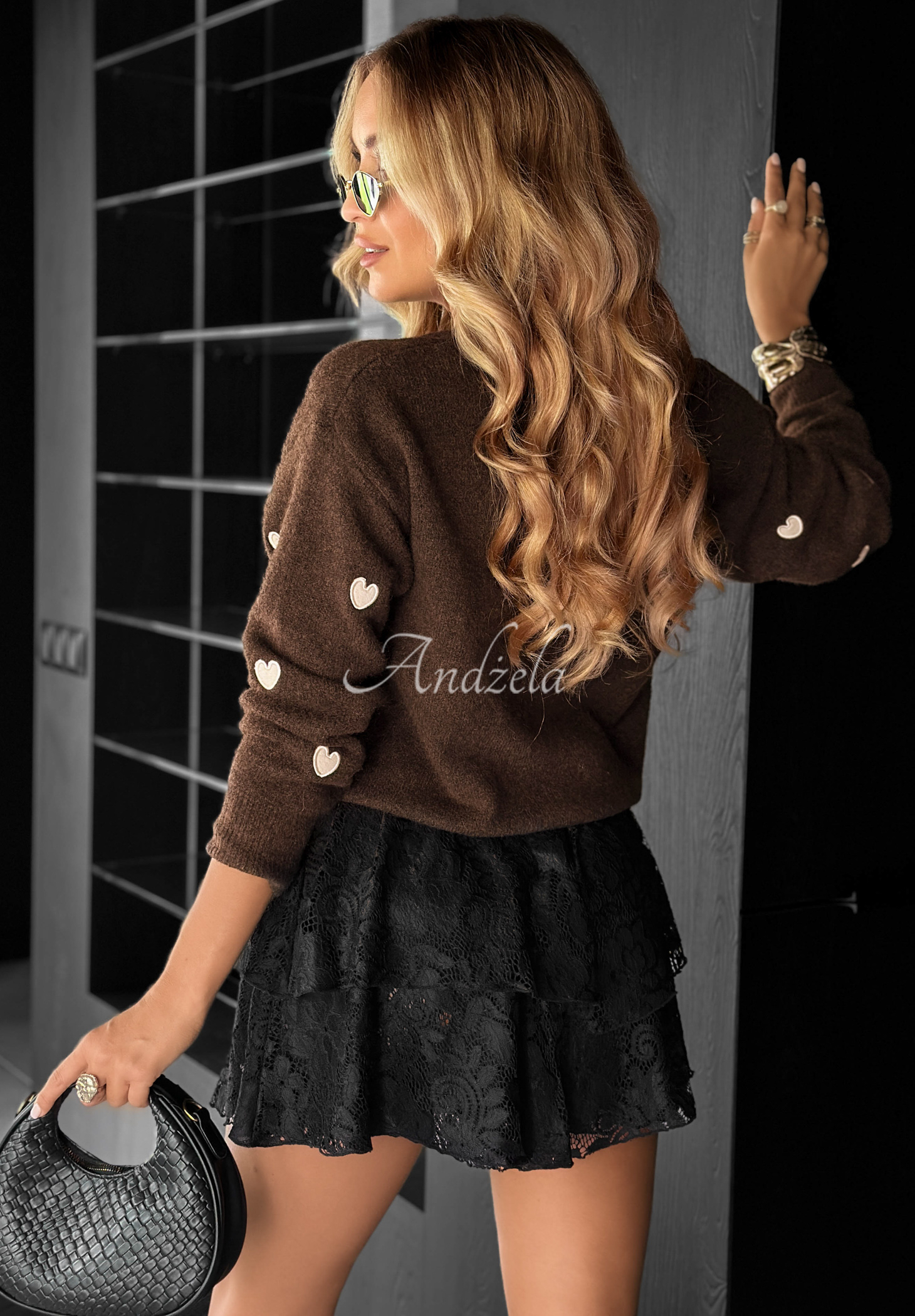 Cardigan scurt cu inimioare, confecționat dintr-un material elastic cu adaos de lână și viscoză. Model cu închidere pe nasturi, are mâneci lungi și partea de jos terminată cu manșete elastice.