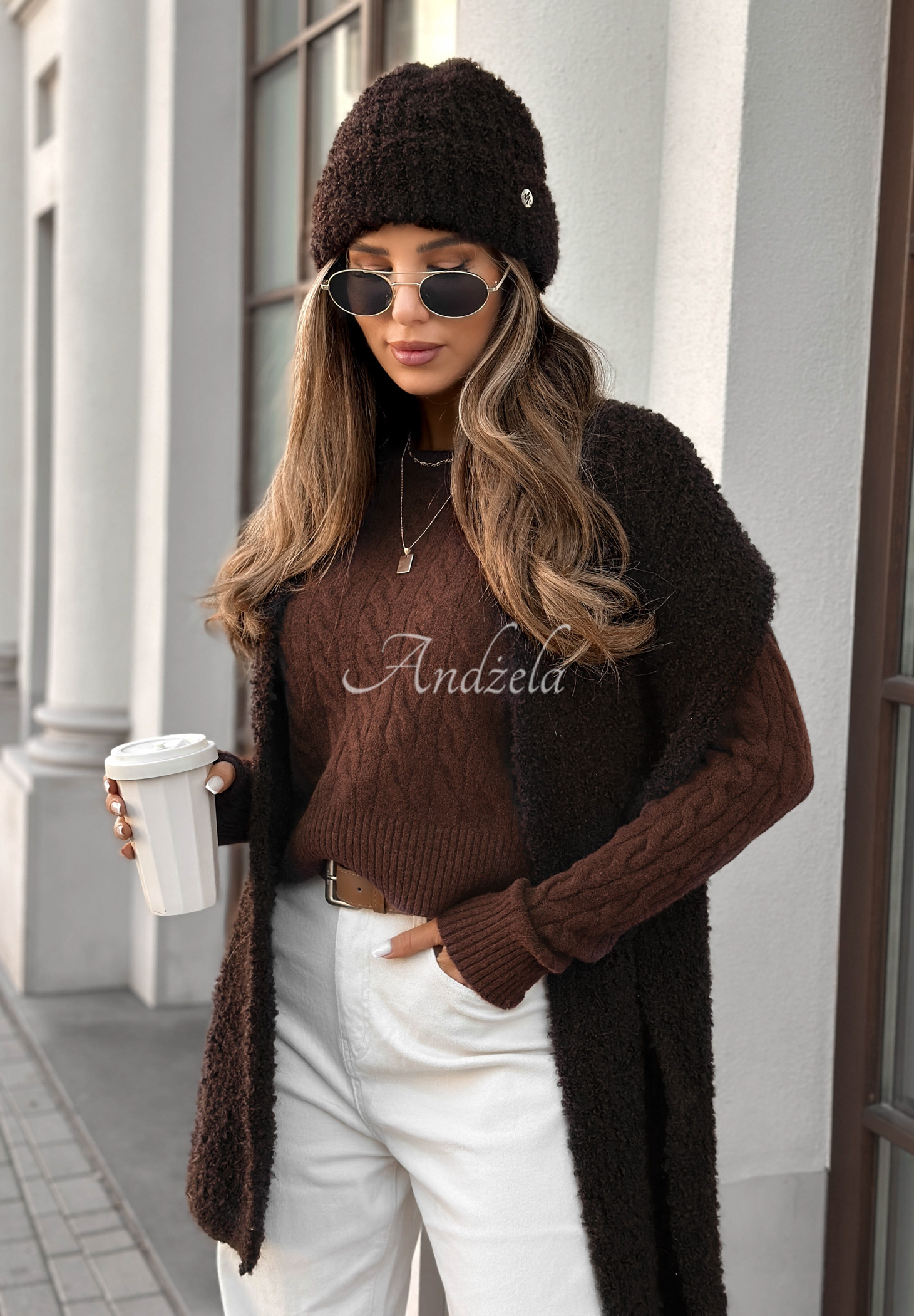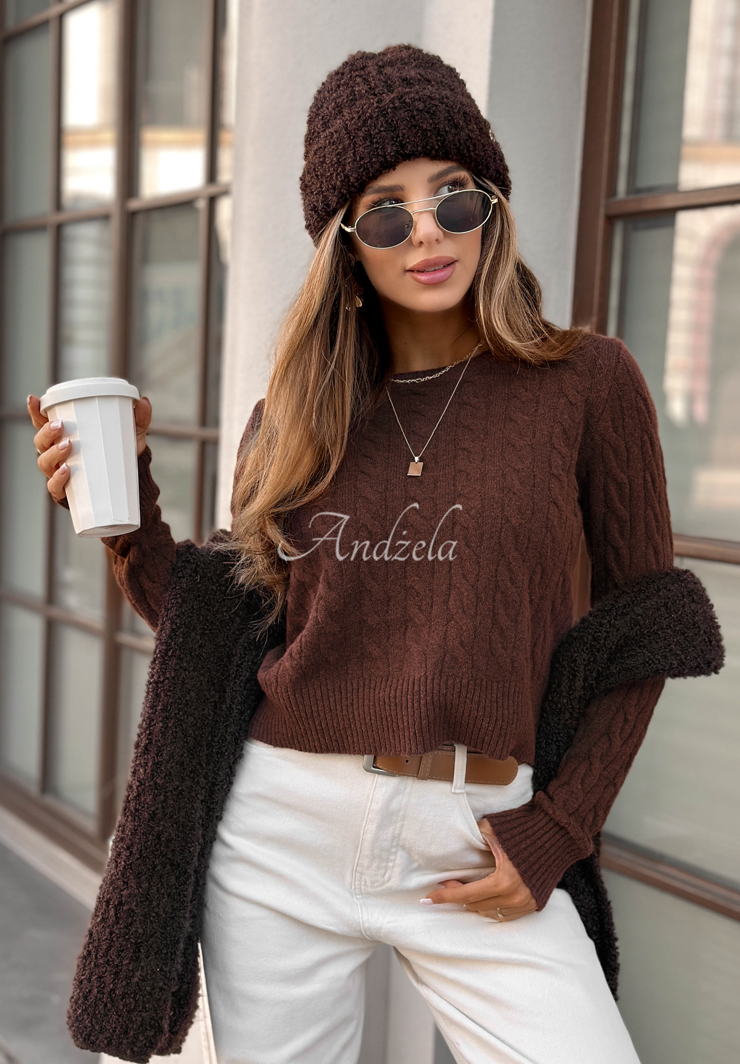 Pulover decorativ împletit, confecționat din material elastic cu adaos de lână. Model cu mâneci lungi, prevăzute cu manșete delicate, la fel ca partea de jos. Are decolteu rotund.