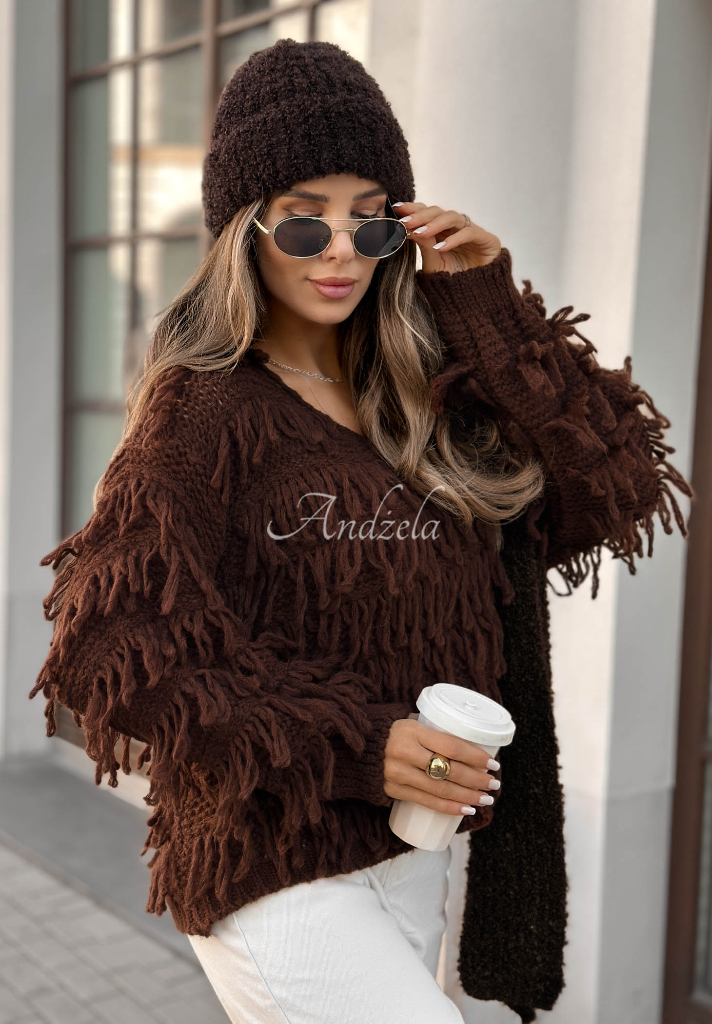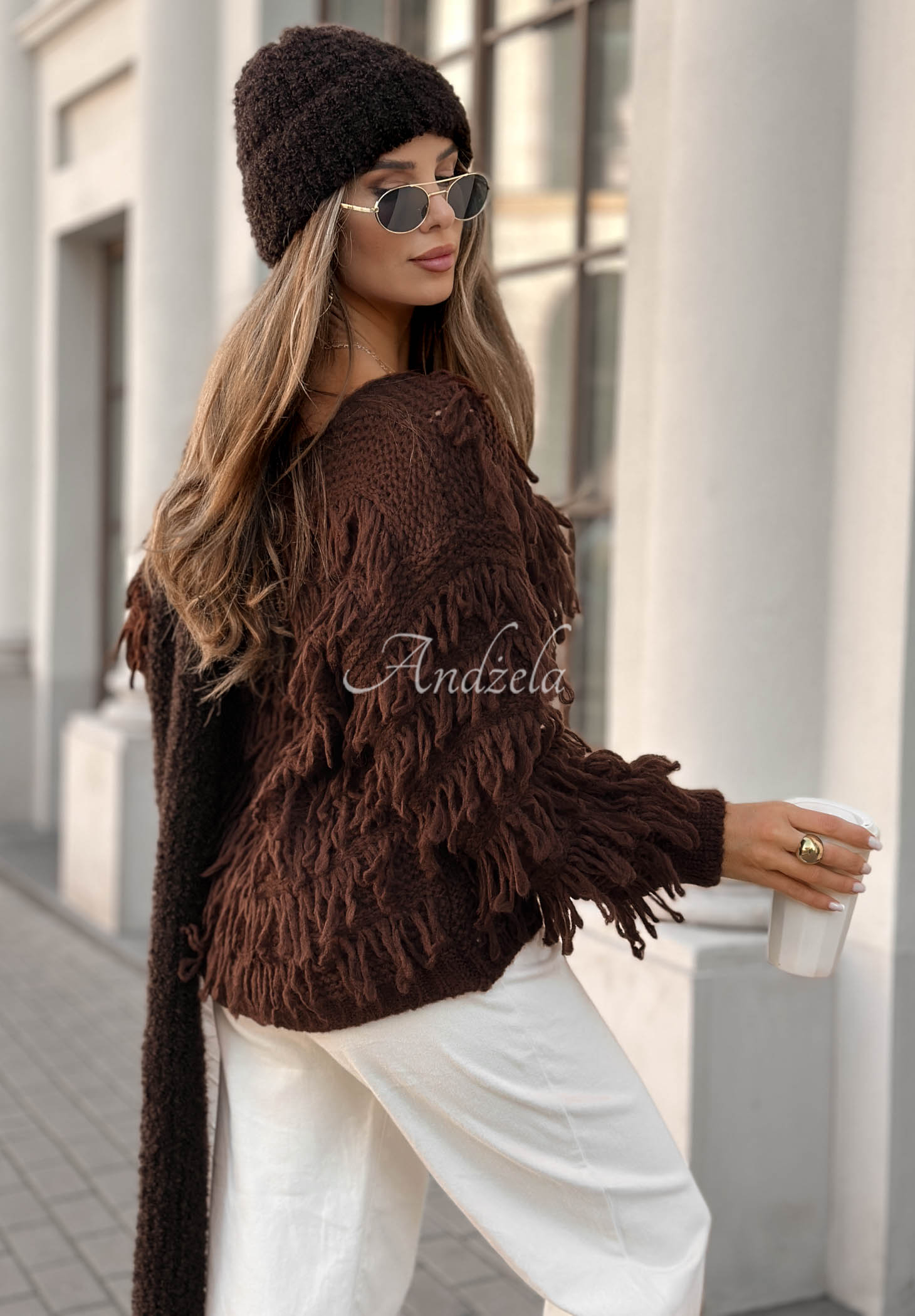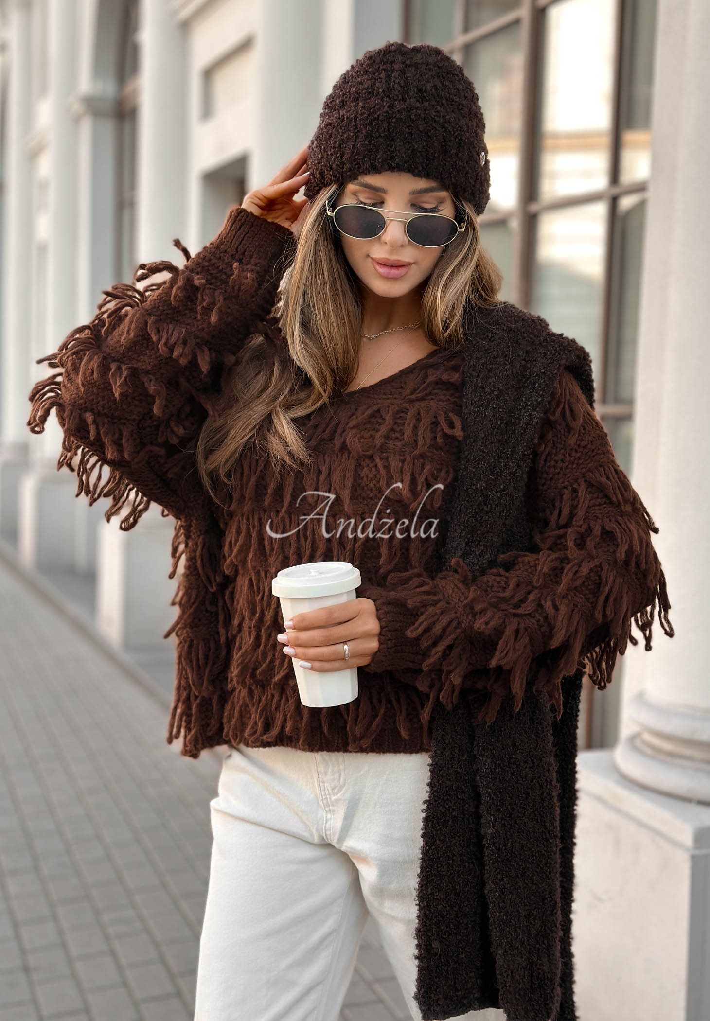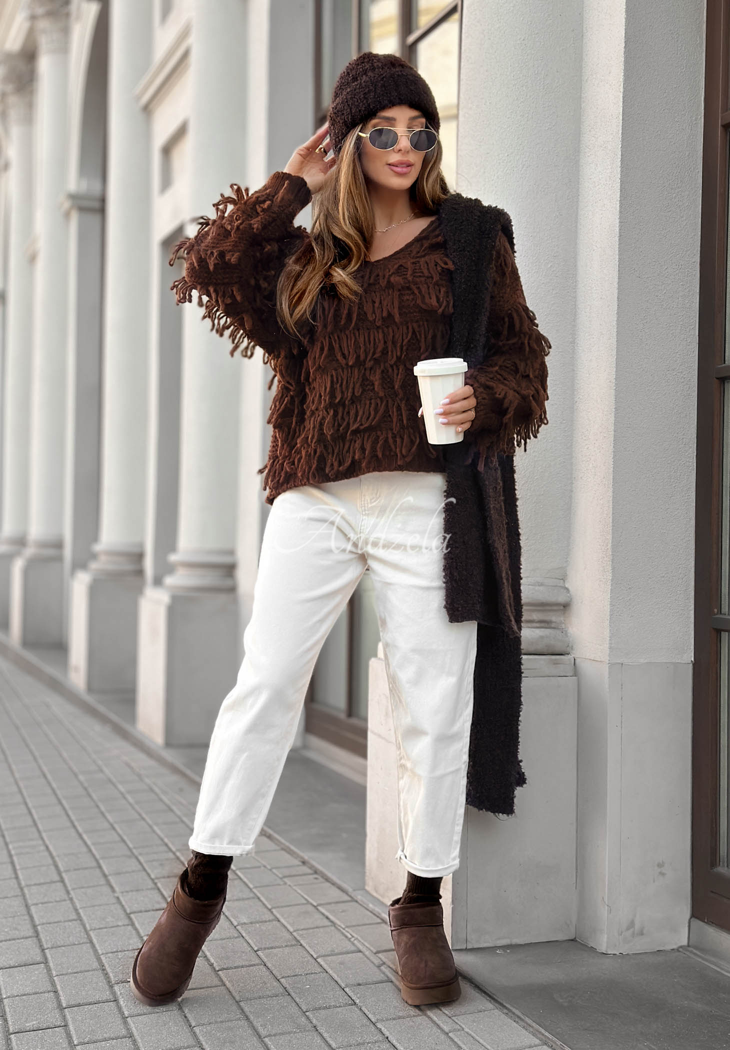 Un pulover călduros, confecționat dintr-un material plăcut și elastic. Se remarcă prin franjurile de efect, care oferă caracter întregii ținute. Această propunere are decolteu în V.