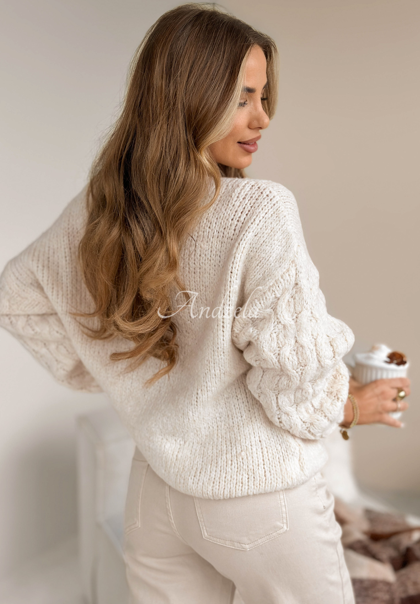 Pulover cu croială ușor oversize, confecționat din material elastic cu adaos de lână și viscoză. Model cu decolteu rotund, care se remarcă prin mânecile împletite. Atât partea de jos, cât și mânecile sunt finisate cu manșete elastice.