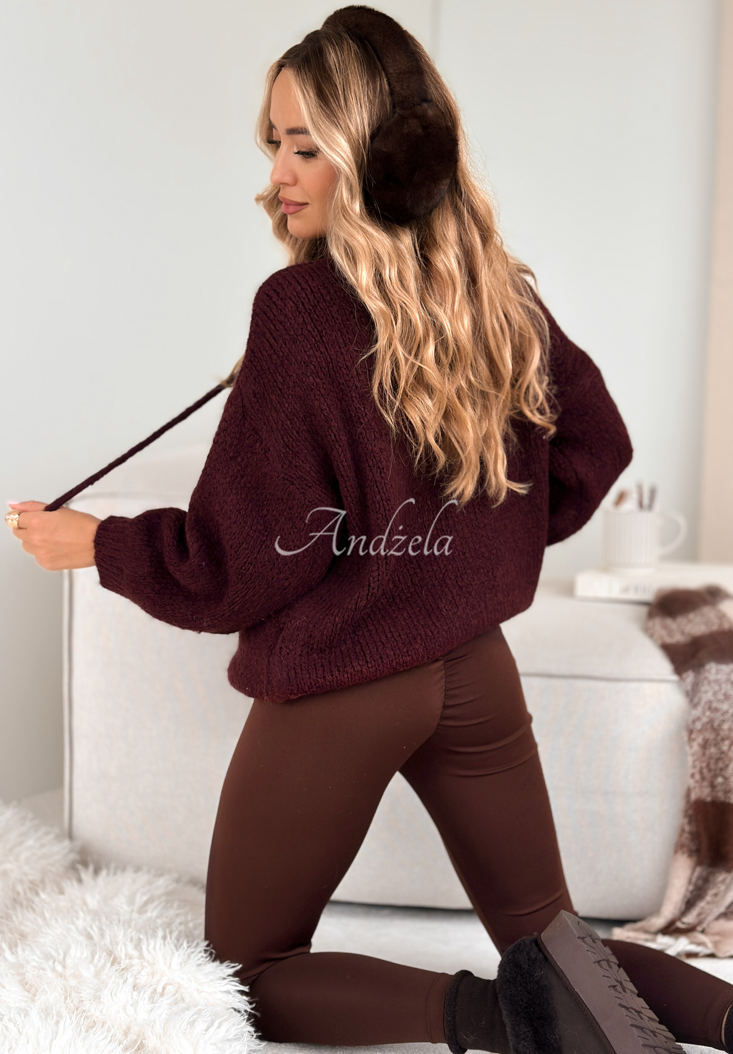 Pulover oversize care se remarcă prin detaliul decorativ cu șnur. Model cu decolteu în V, confecționat din material elastic cu adaos de lână și viscoză. Partea de jos și mânecile sunt finisate cu manșete elastice.