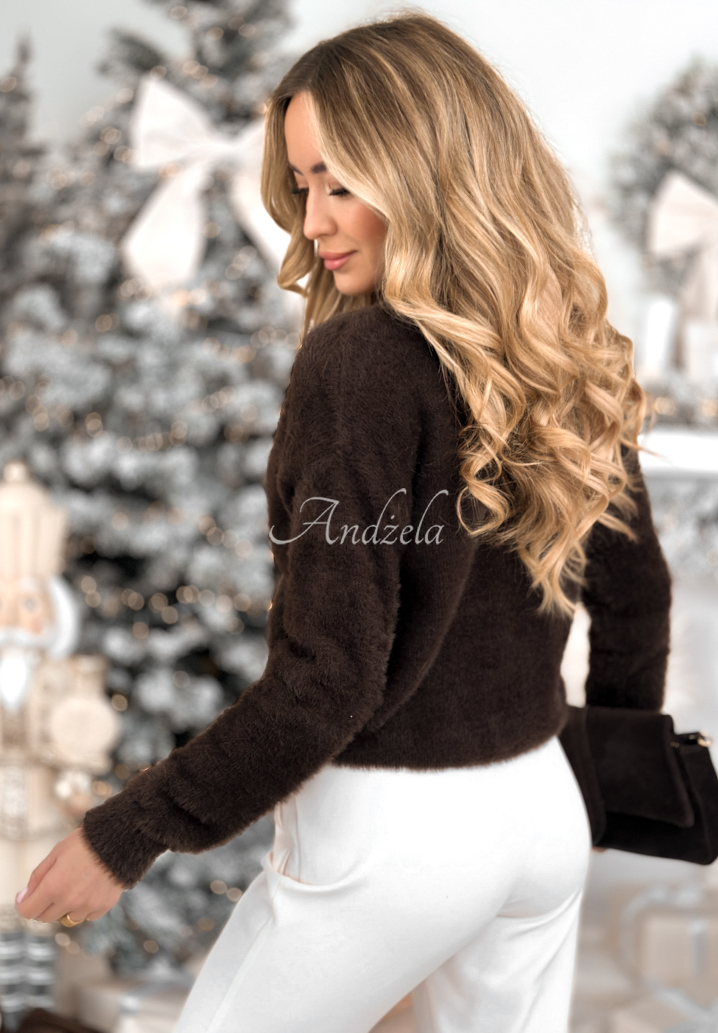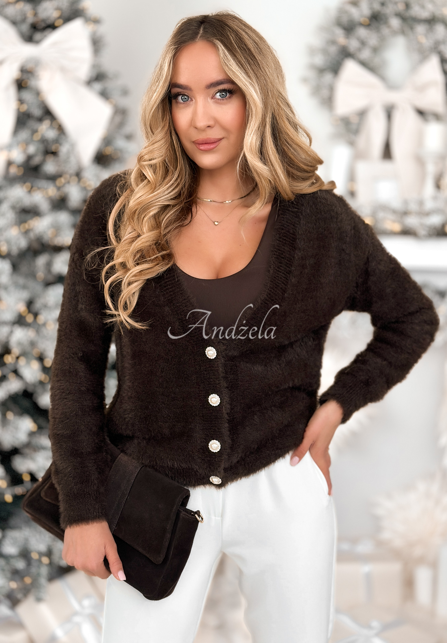 Cardigan scurt din alpaca, cu decolteu în V. Se remarcă prin închiderea cu nasturi argintii, strălucitori, cu perlă. Partea de jos a produsului și mânecile sunt finisate cu manșete elastice.
