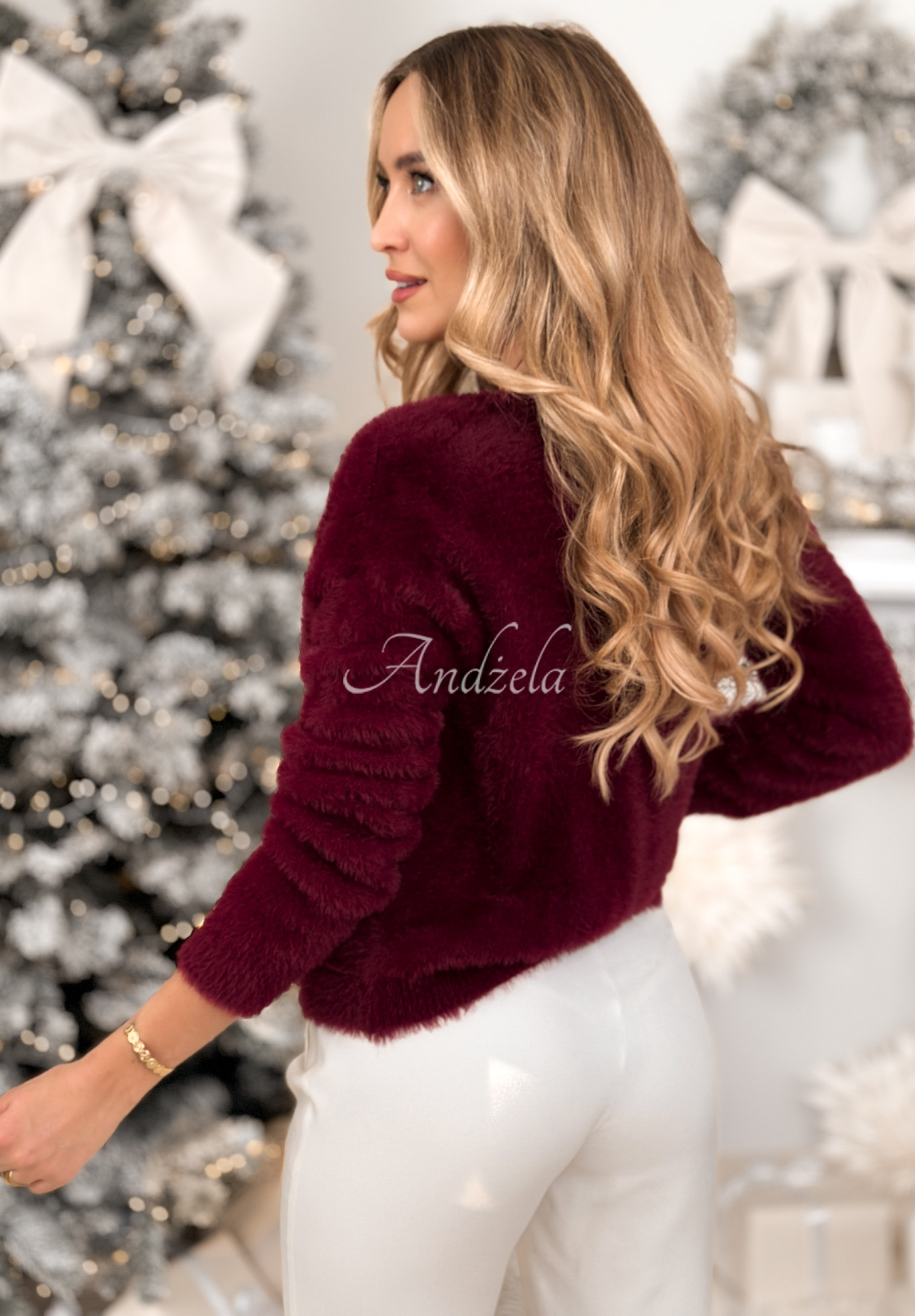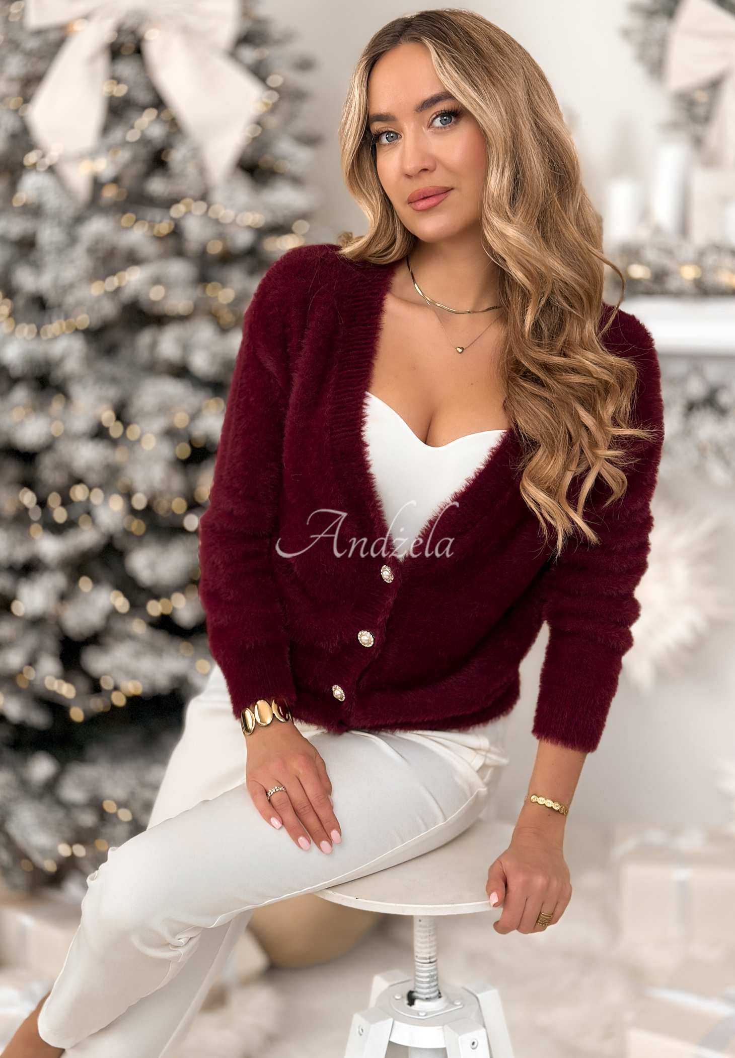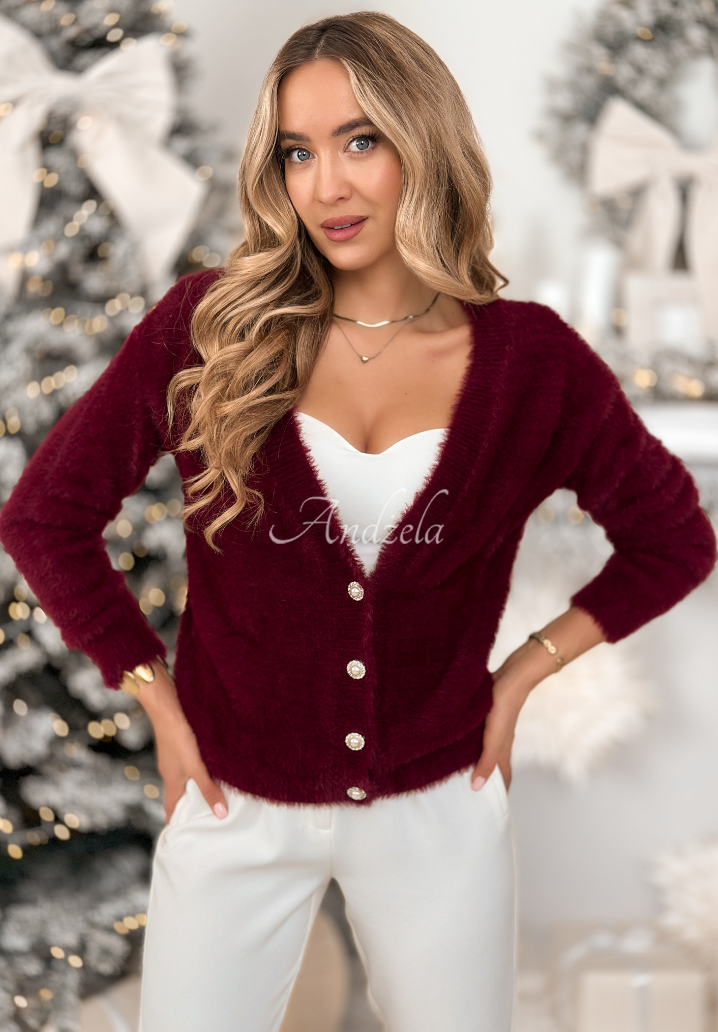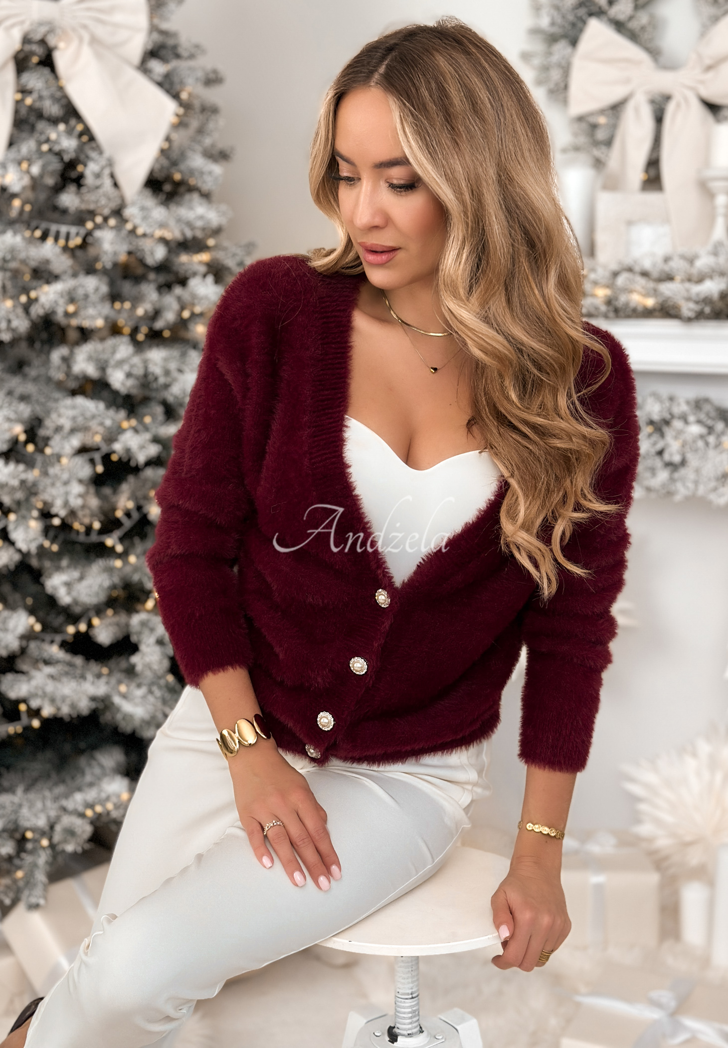 Cardigan scurt din alpaca, cu decolteu în V. Se remarcă prin închiderea cu nasturi argintii, strălucitori, cu perlă. Partea de jos a produsului și mânecile sunt finisate cu manșete elastice.