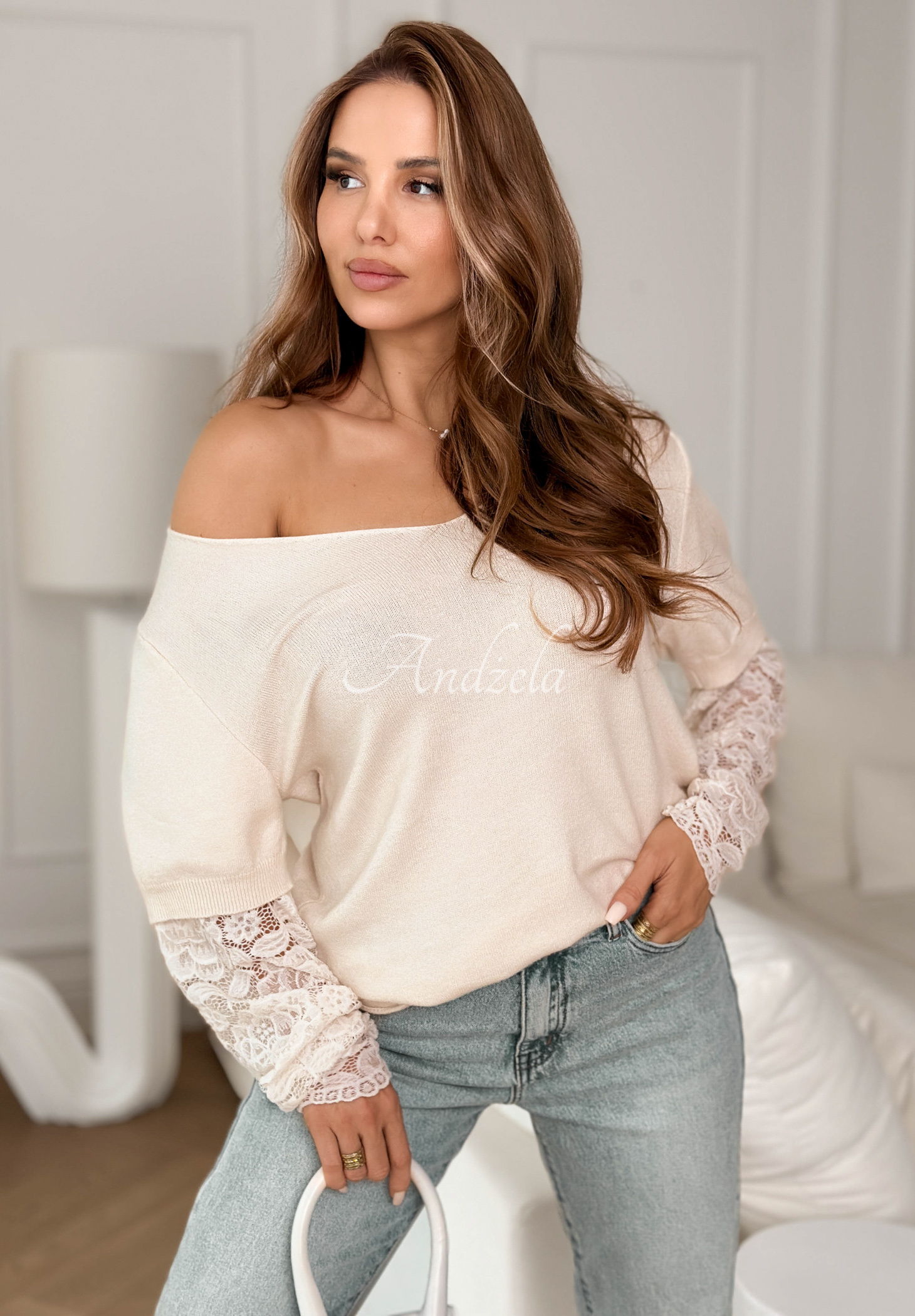 Pulover ușor realizat din material de viscoză moale și plăcut la atingere. Este un model cu decolteu feminin în formă de V. Se remarcă prin mânecile din dantelă. * material elastic* decolteu în formă de V* mâneci din dantelă