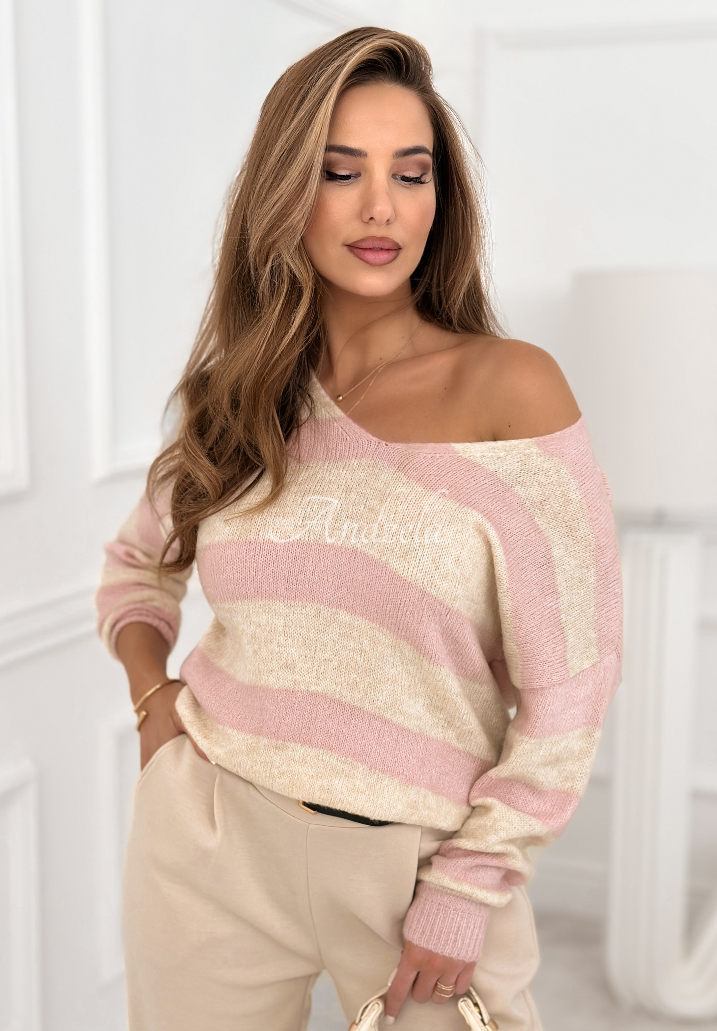 Pulover lejer în dungi, realizat din material foarte plăcut la atingere. Modelul are manșete delicate la terminația mânecilor și în partea de jos. Este o propunere cu decolteu în V și linia umerilor coborâtă.