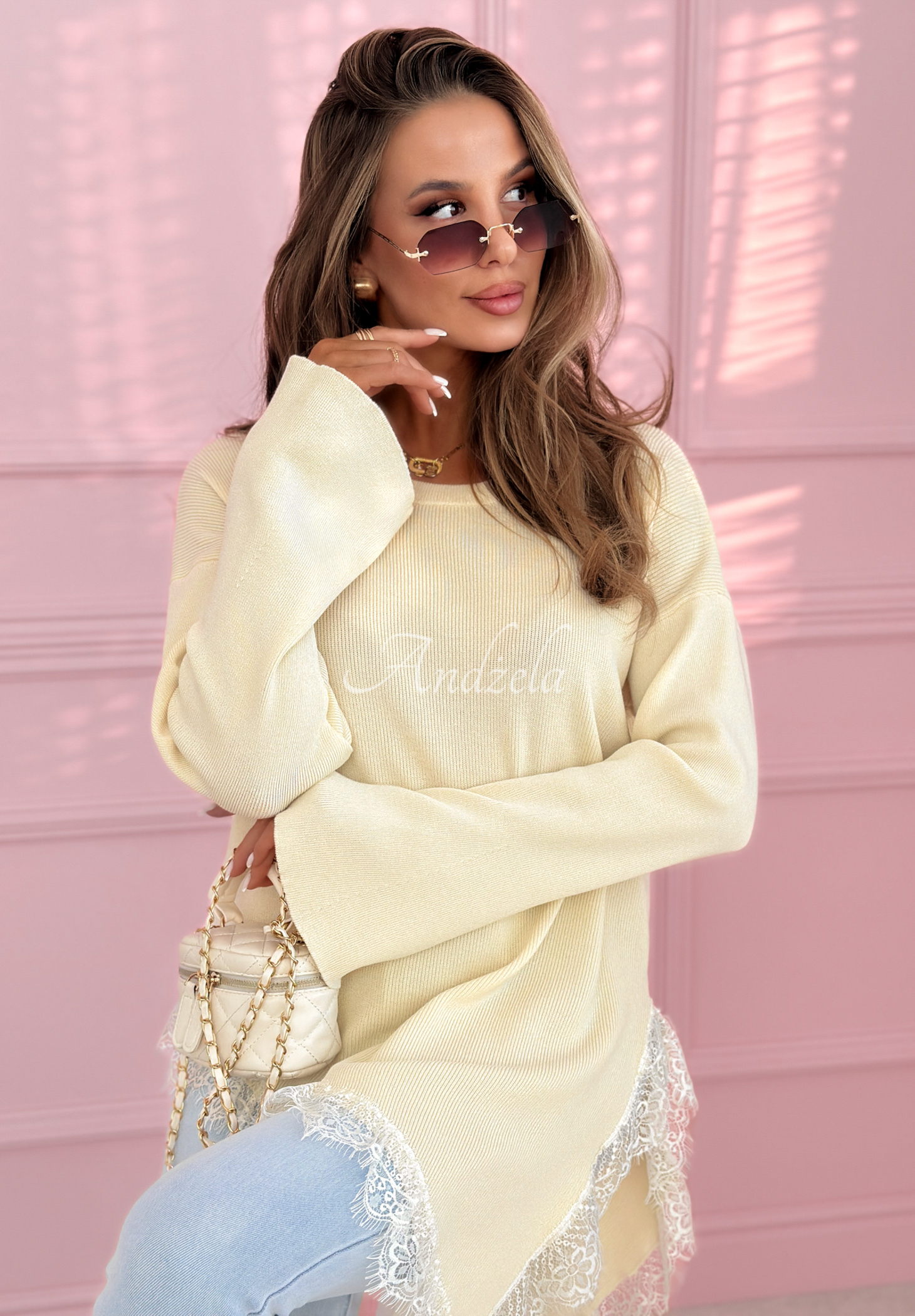 Pulover asimetric cu inserții din dantelă. Este un model cu decolteu rotunjit și mâneci lungi, ușor evazate la capăt. Realizat din material elastic din viscoză.