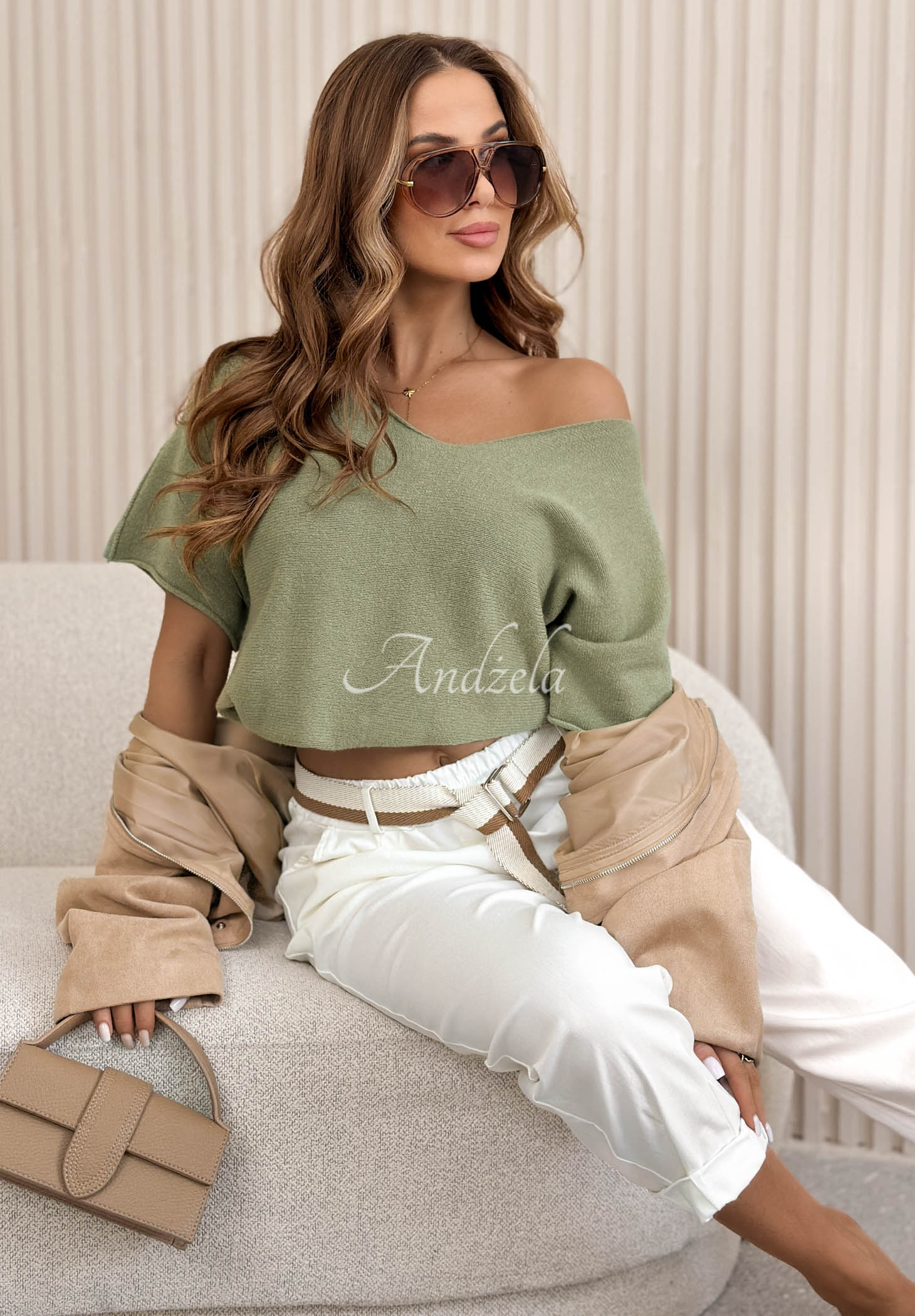 Pulover ușor realizat dintr-un material moale și plăcut la atingere, cu adaos de viscoză. Este un model cu croială mai oversize, cu decolteu feminin în V.