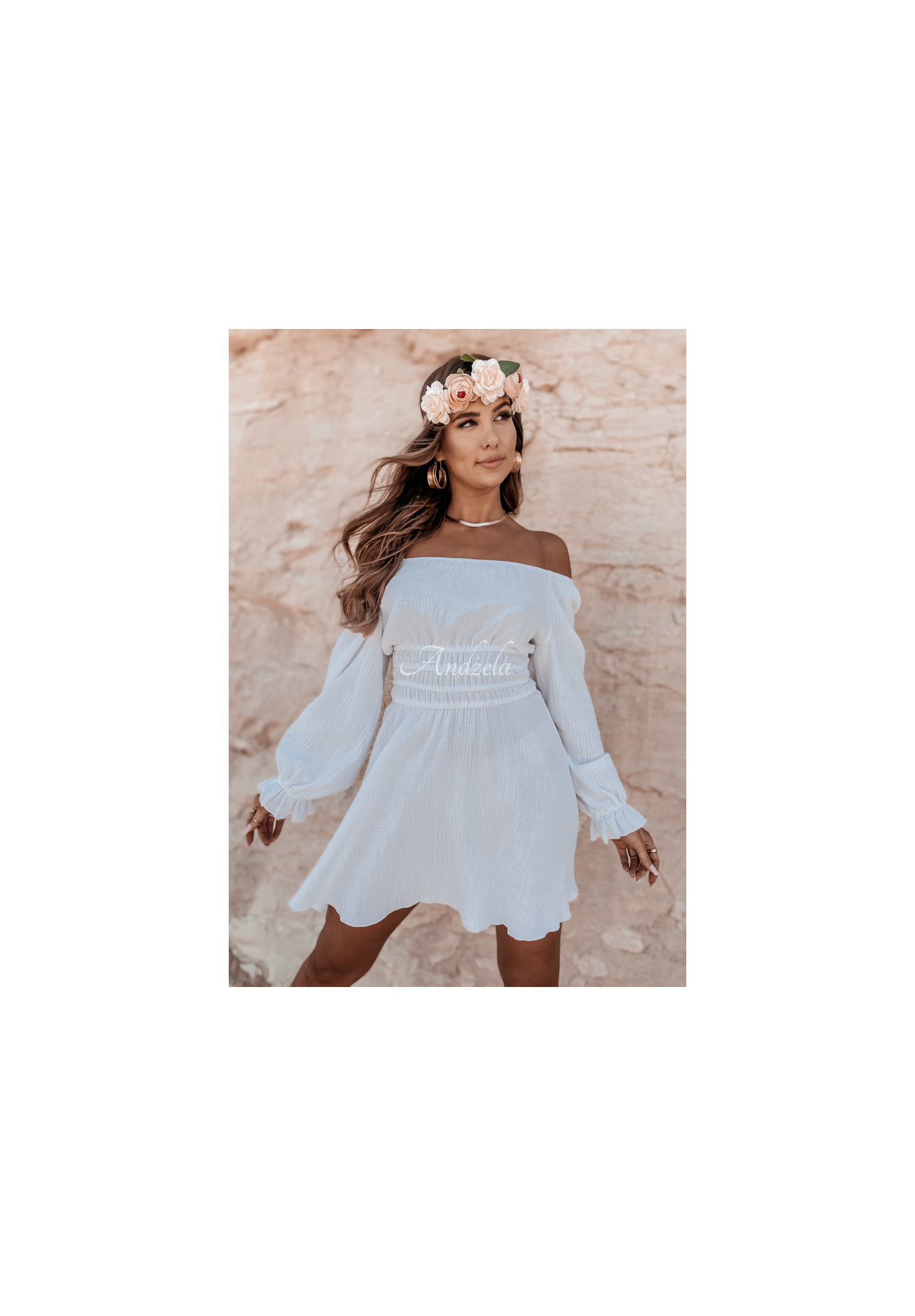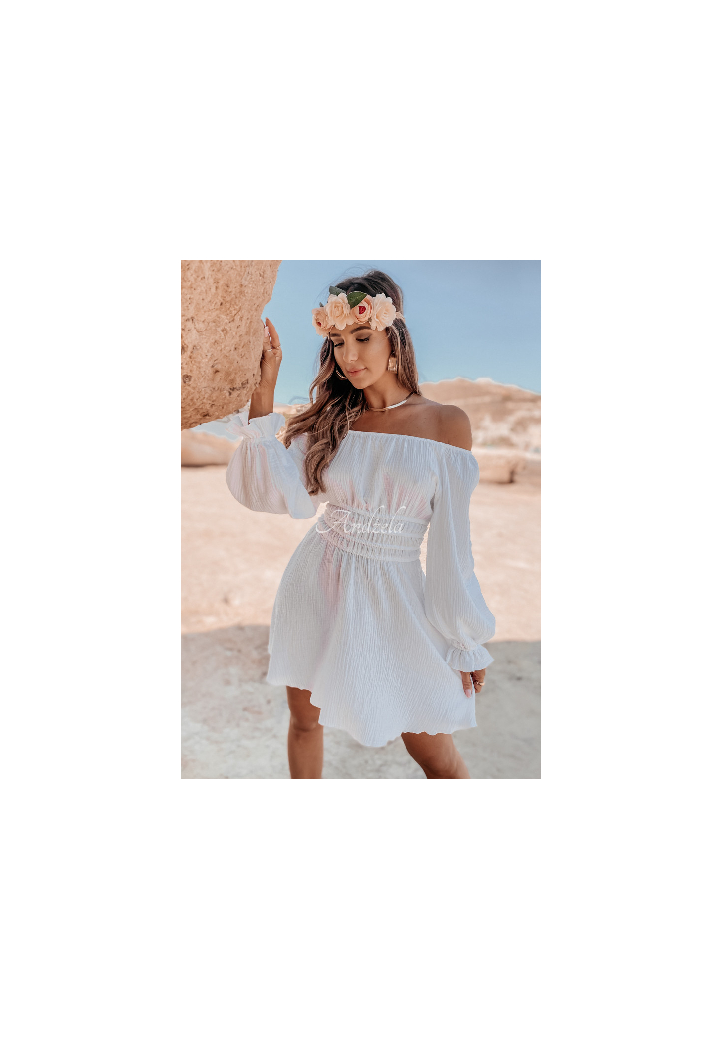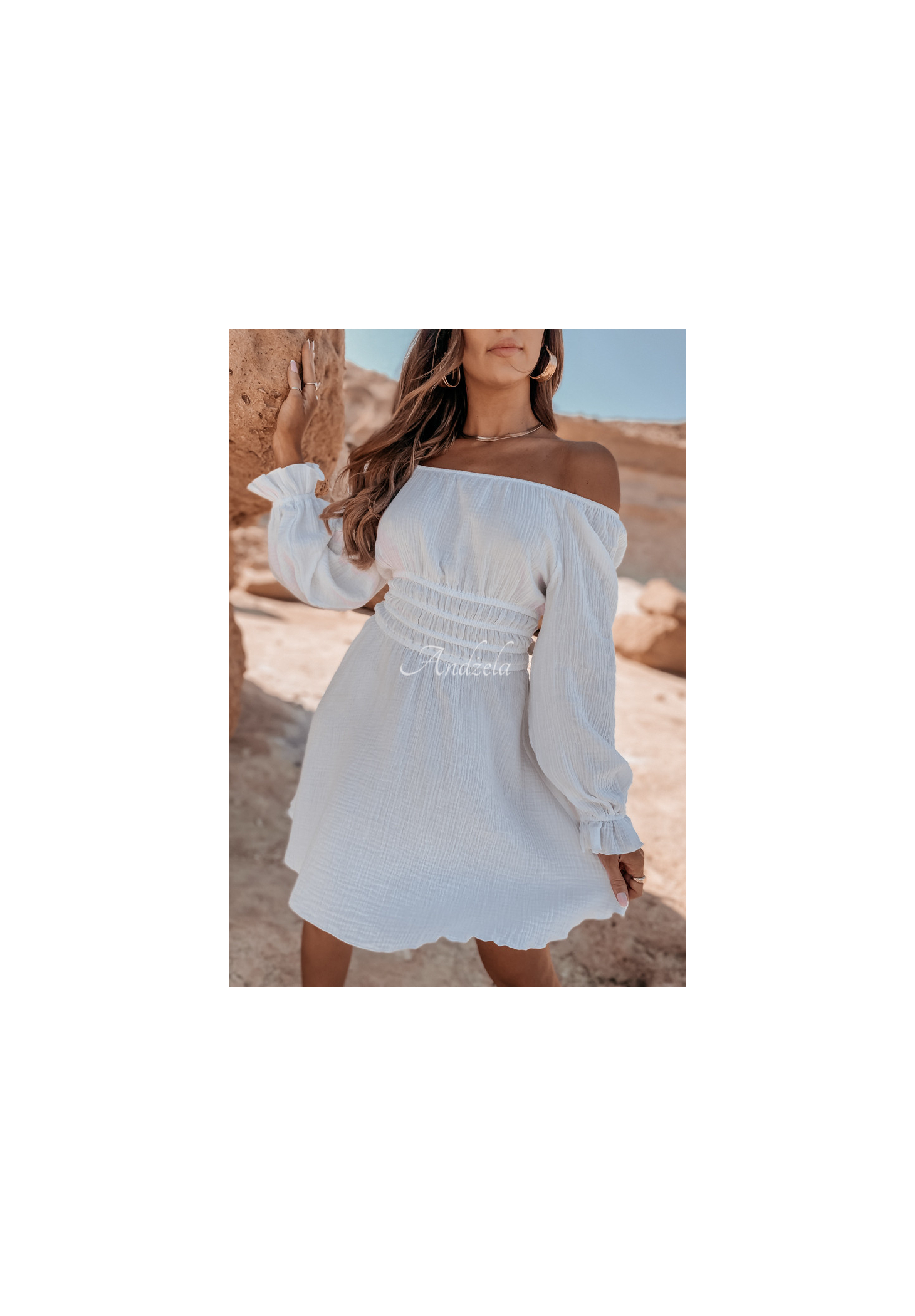 Rochie spaniolă creată din muselină, perfectă pentru zilele caniculare. Model cu mâneci lungi, are patru benzi elastice la talie, care vor sublinia fenomenal silueta. Un produs de calitate înaltă, disponibil în mai multe culori. Proiect by ANDŻELA
