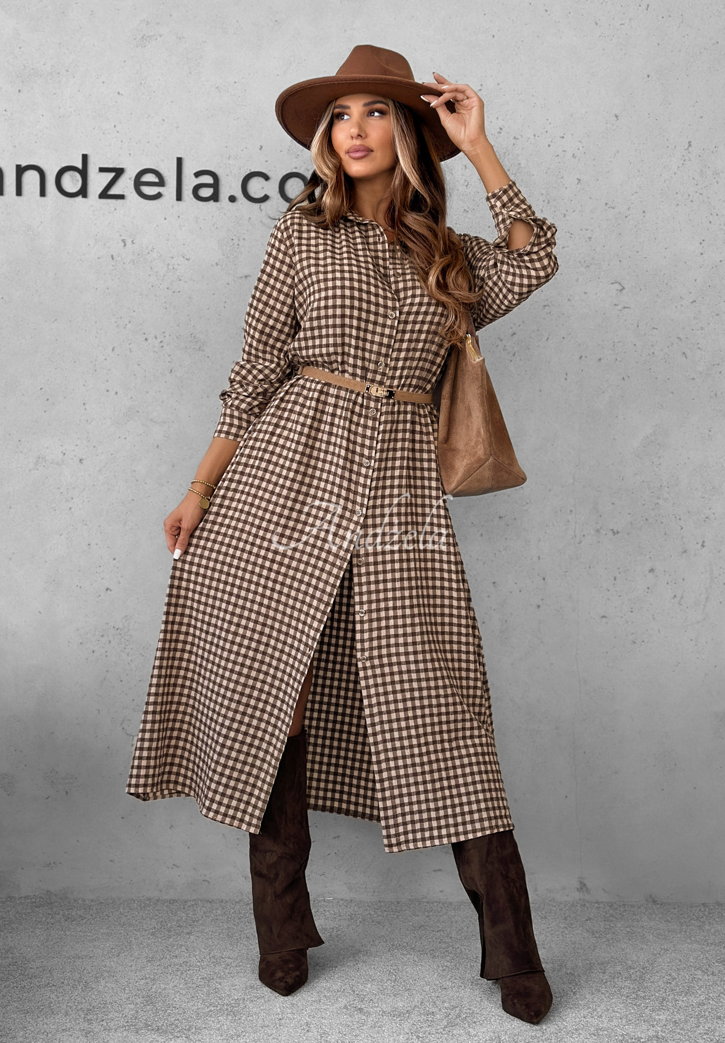 Rochie cu carouri, confecționată din material cu adaos de bumbac și viscoză. Model oversize, cu guler și închidere cu nasturi. Dispune de buzunare funcționale în față și mâneci terminate cu manșete.