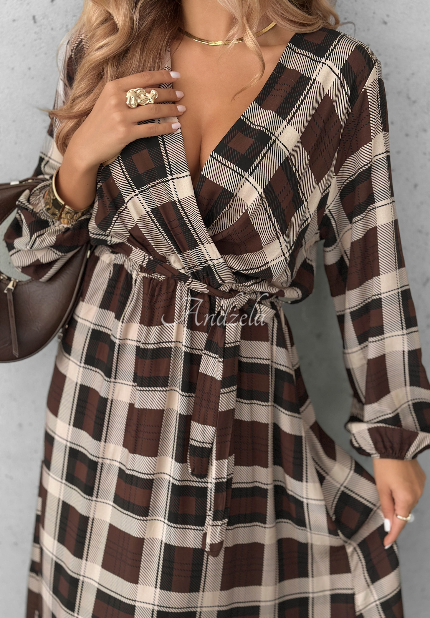 Rochie lejeră în carouri, confecționată dintr-un material de viscoză neelastic. Model midi, cu decolteu petrecut și volănașe în partea de jos. Are mâneci lungi terminate cu manșete elastice. Talie elastică, completată de o curea inclusă.