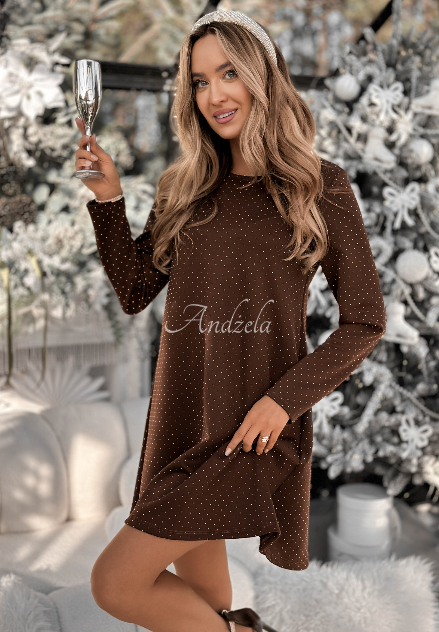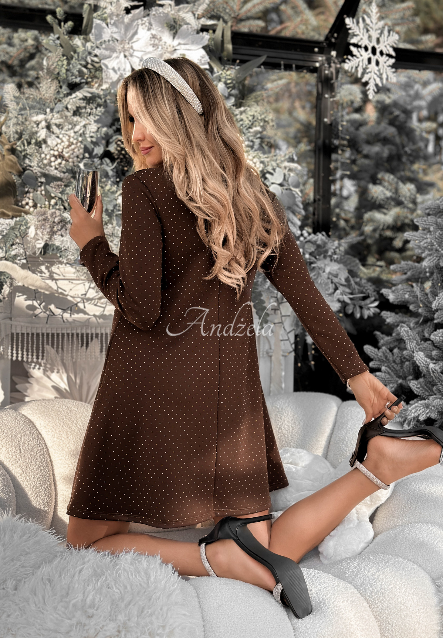 Rochie deosebită, decorată cu cristale strălucitoare, confecționată din material elastic cu conținut de viscoză. Model cu croială evazată și decolteu rotunjit.