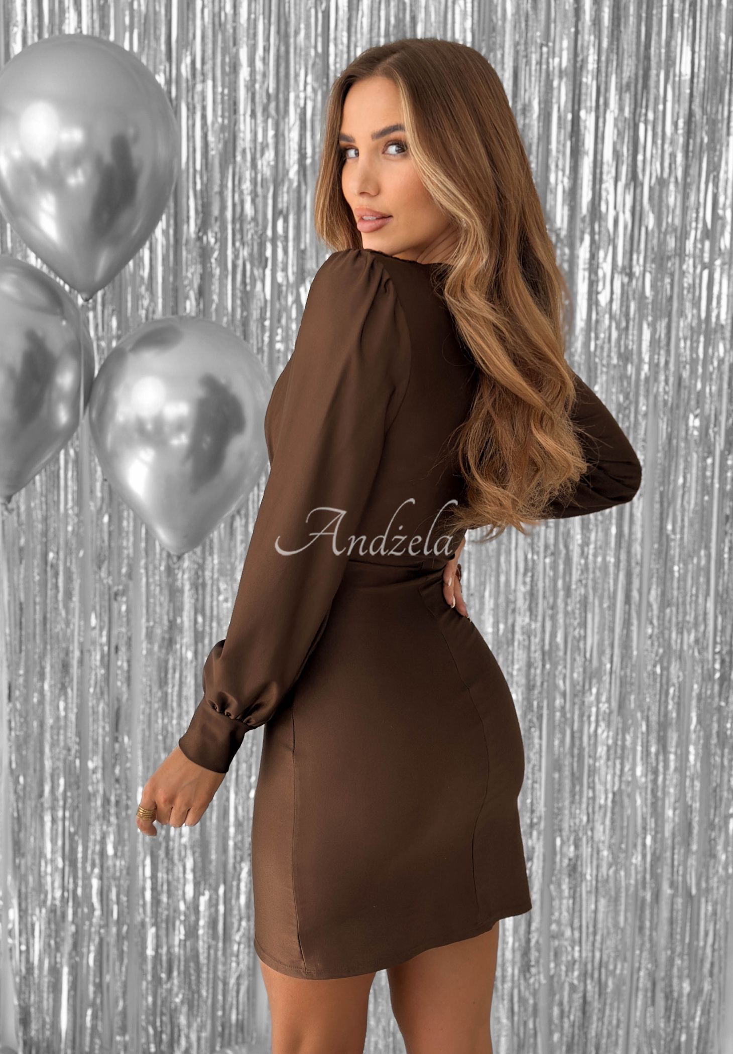 Rochie elegantă, cu decolteu suprapus și curea decorativă. Este un model scurt, de tip mini, cu mâneci lungi și decupaj sub bust. Întreaga piesă este realizată din material elastic.