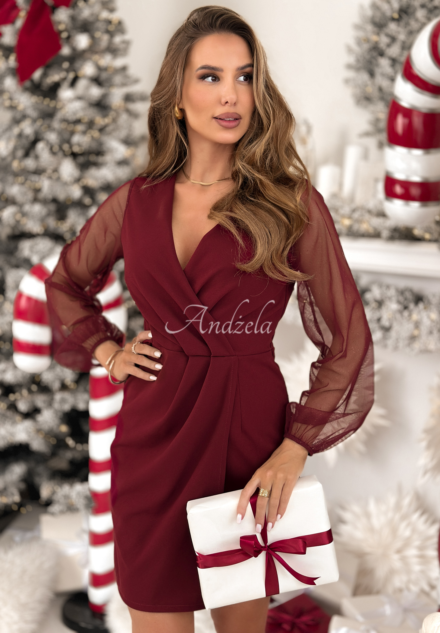 Rochie mini cu decolteu petrecut, care se remarcă prin mânecile transparente și strălucitoare din plasă fină. Se închide cu fermoar la spate.