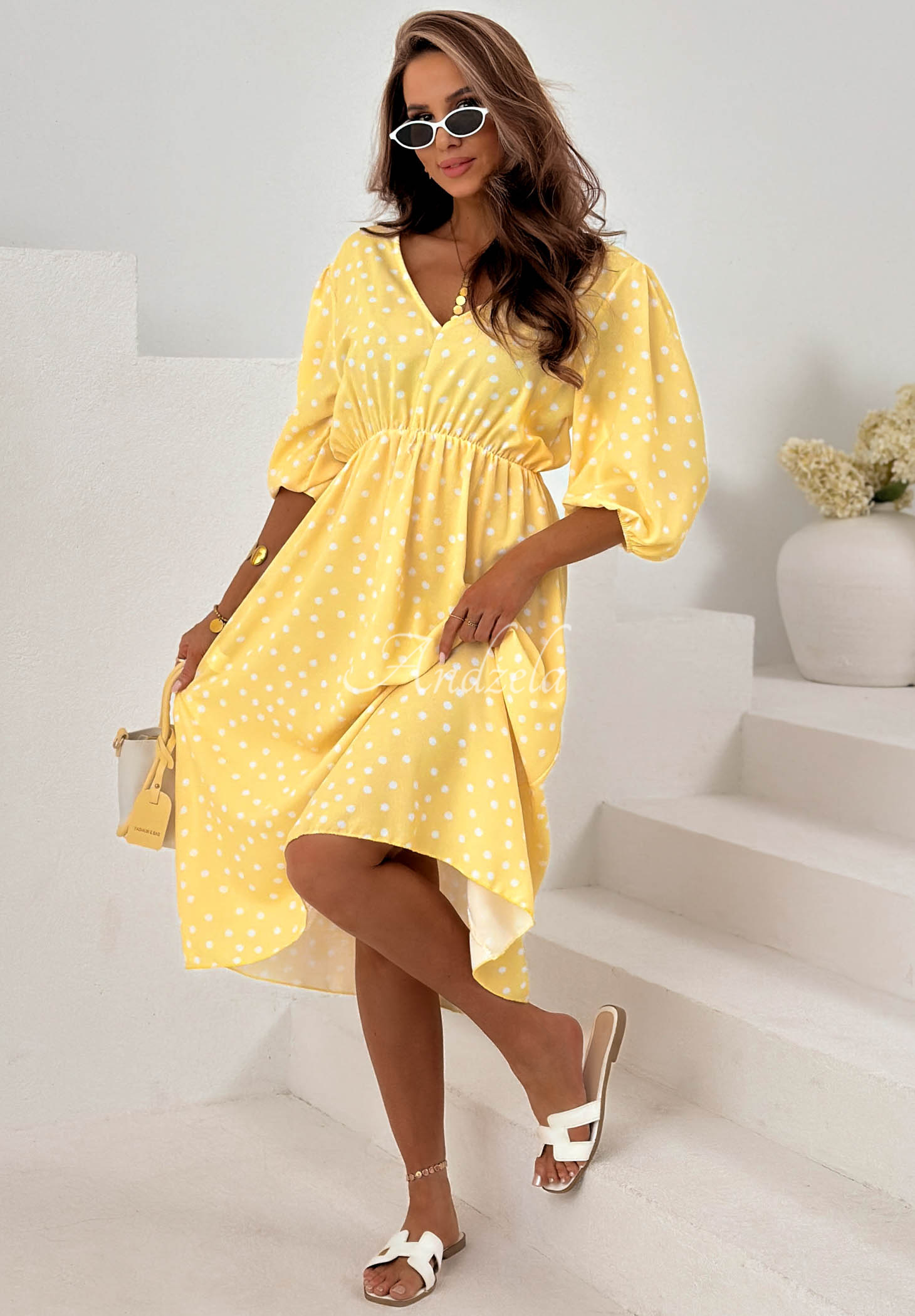 Modelul are înălțimea de 165 cm și poartă mărimea S/M.
