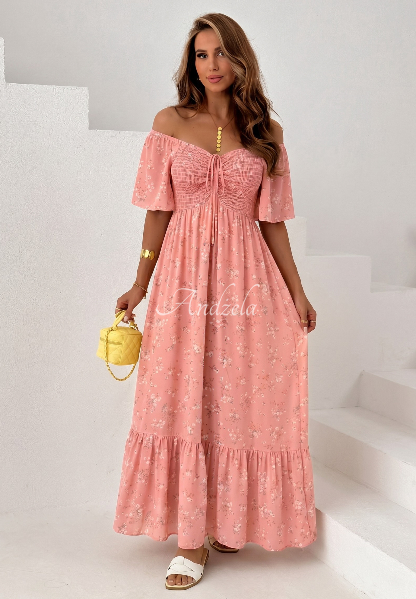 Rochie al cărei punct forte este imprimeul floral și volănașul aerisit în partea de jos. Este un model prevăzut cu elastic și șnur reglabil, amplasat în partea de sus. Realizată din țesătură din viscoză.