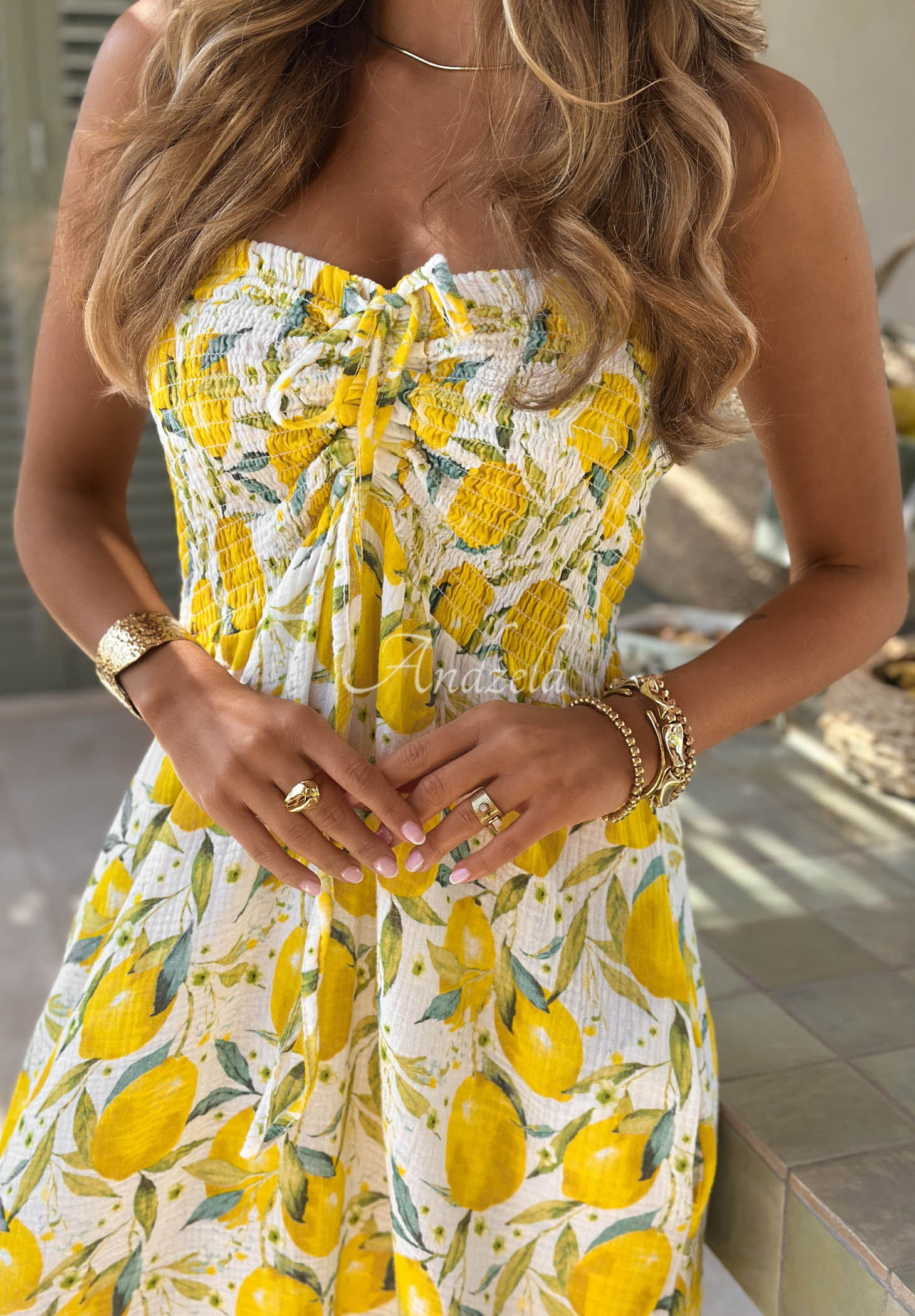 Rochie lejeră din bumbac, cu lungime maxi, cu volănașe. Nu are bretele, iar în partea de sus are pliuri elastice late cu șnur.* material neelastic* pliuri elastice în partea de sus cu șnur* fără bretele* fără căptușeală* volănașe* lungime maxi