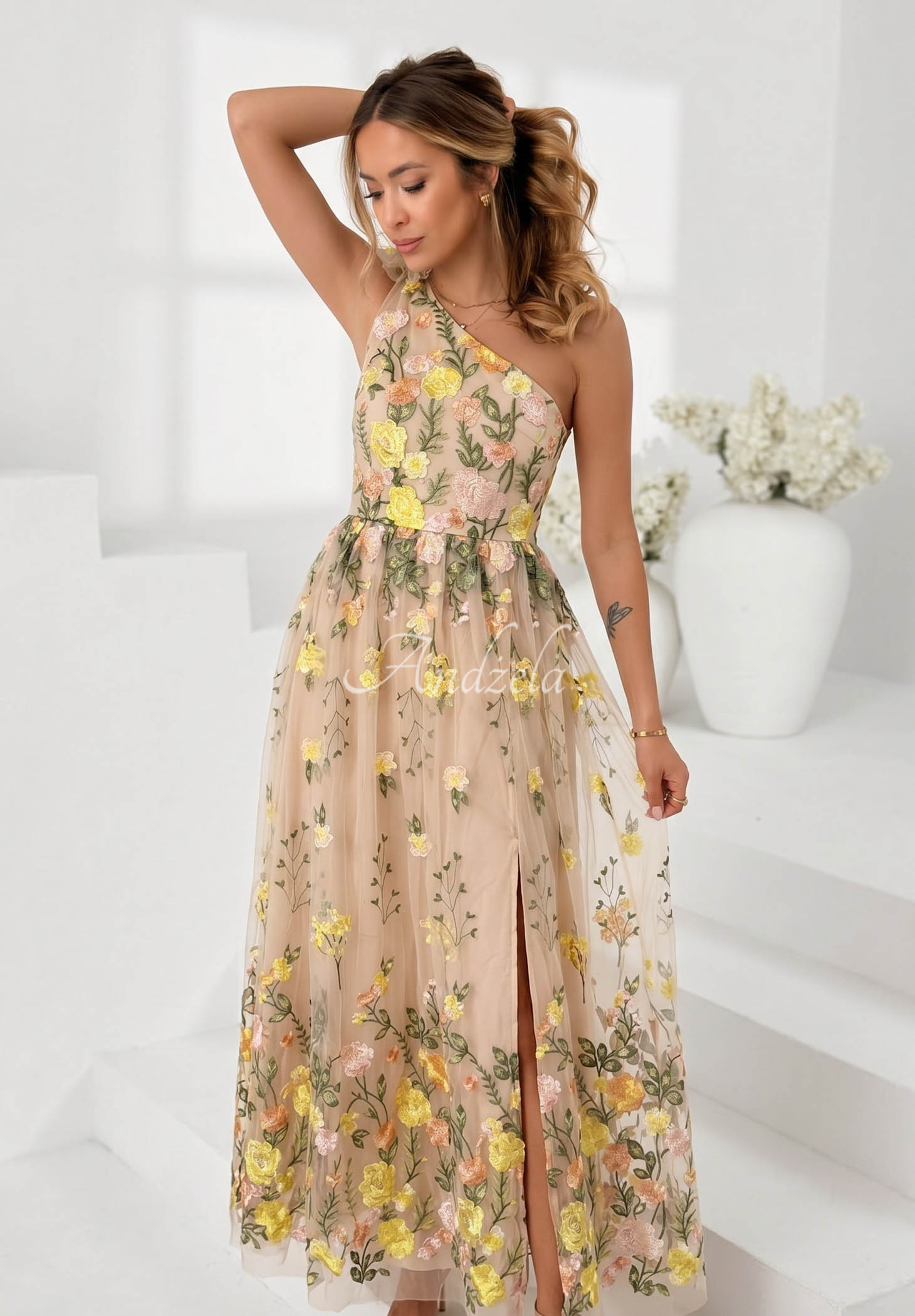 Rochie din tul, evidențiată prin flori brodate pe întreaga suprafață. Este un model cu lungime maxi, cu închidere cu fermoar pe lateral. În interior are căptușeală, iar în set este inclusă o broșă.
