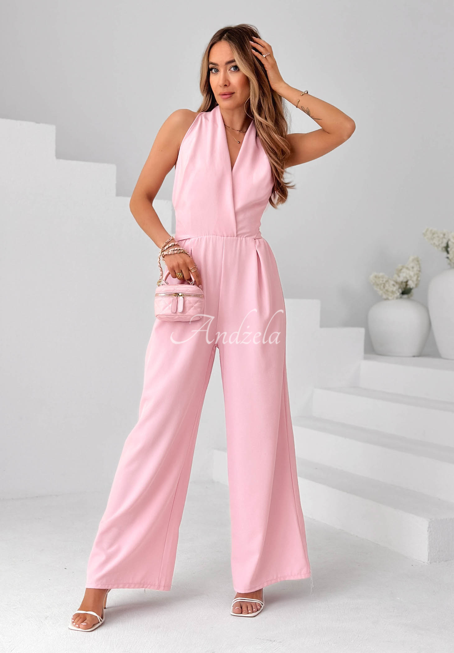 Salopetă lungă, evidențiată prin legarea decorativă. Modelul are decolteu petrecut și pantaloni cu picior larg. Este prevăzută cu talie înaltă și elastic în talie pentru confort.