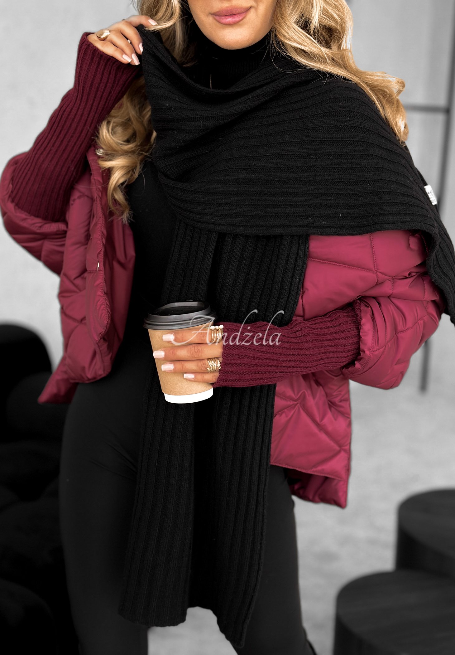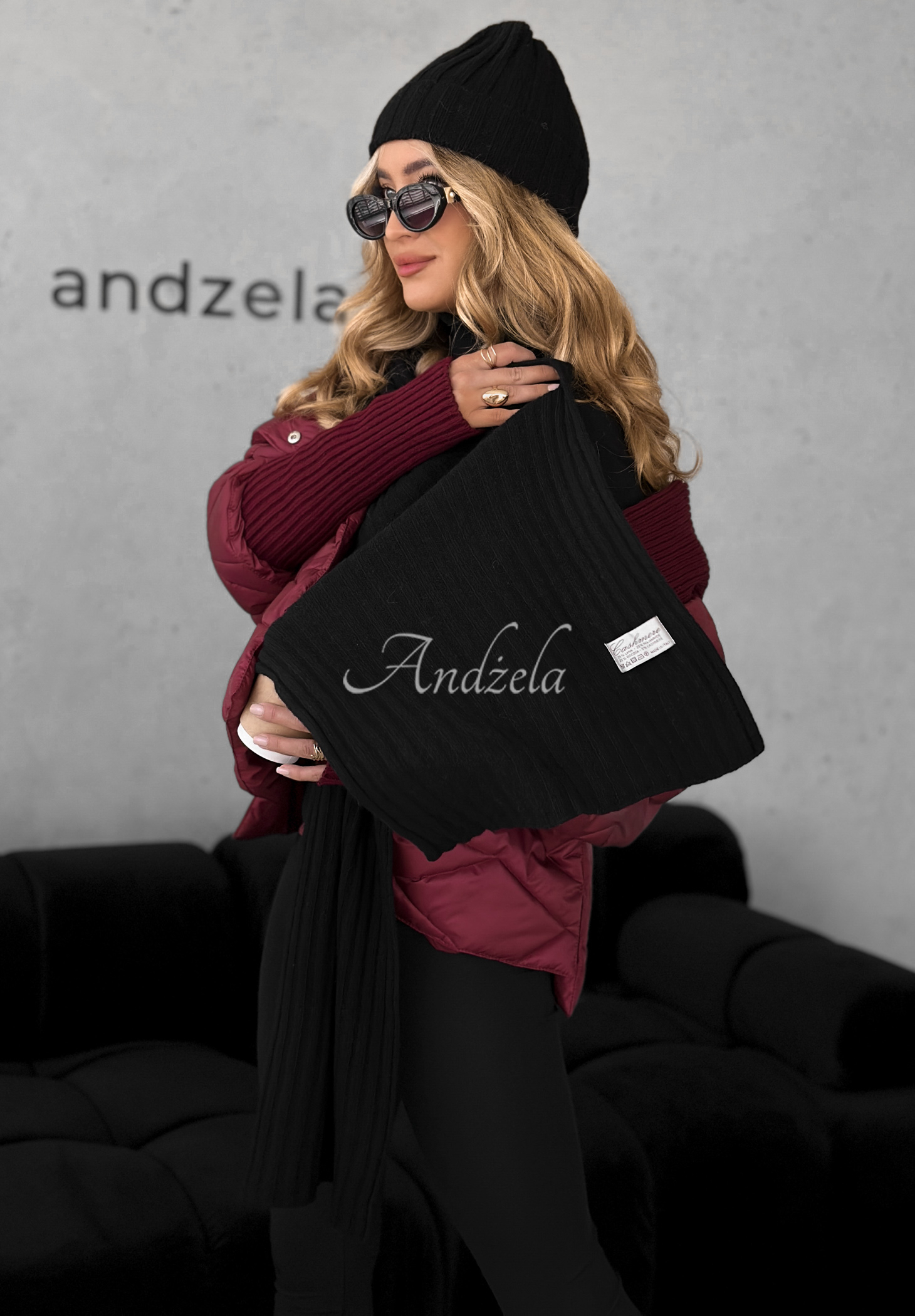 Set confecționat din material moale, cu adaos de lână, viscoză și cașmir. Atât căciula, cât și fularul se remarcă prin textura decorativă cu striații.