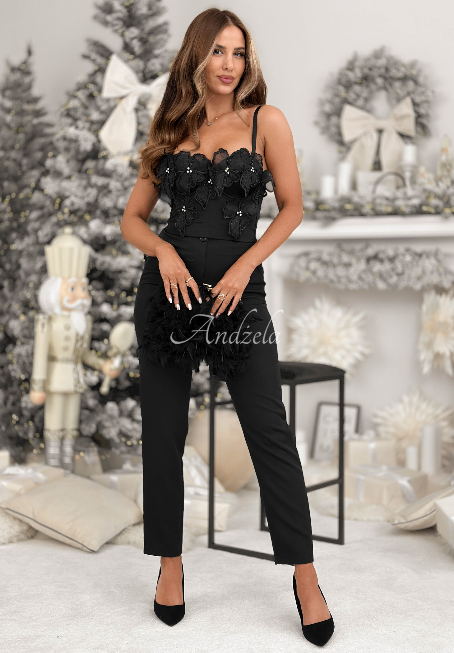 Topul scurt este o propunere ideală pentru ocazii speciale. Se remarcă prin florile decorative cusute. Modelul are bretele reglabile și cupe întărite. Este o variantă cu închidere la spate, prevăzută cu mai multe capse.