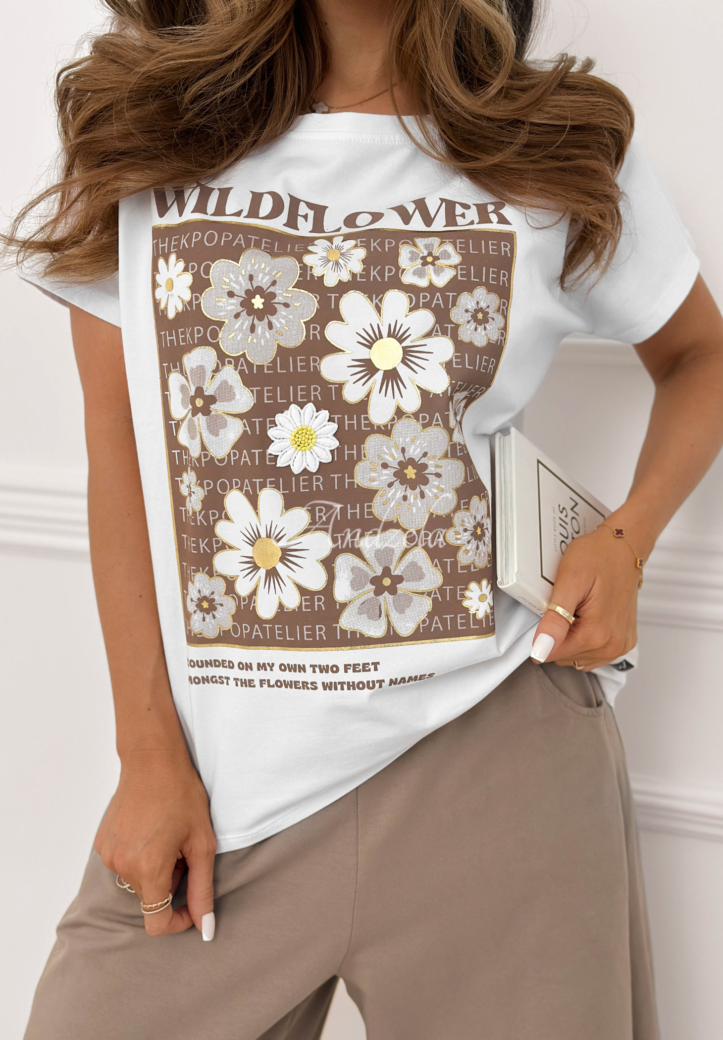 Tricou moale realizat din bumbac de înaltă calitate. Se remarcă prin imprimeul din partea din față, decorat suplimentar cu accente aurii și o aplicație în formă de floare. Este un model elastic cu croială clasică, cu mâneci scurte și decolteu rotunjit, precum și cu partea din spate ușor mai lungă.