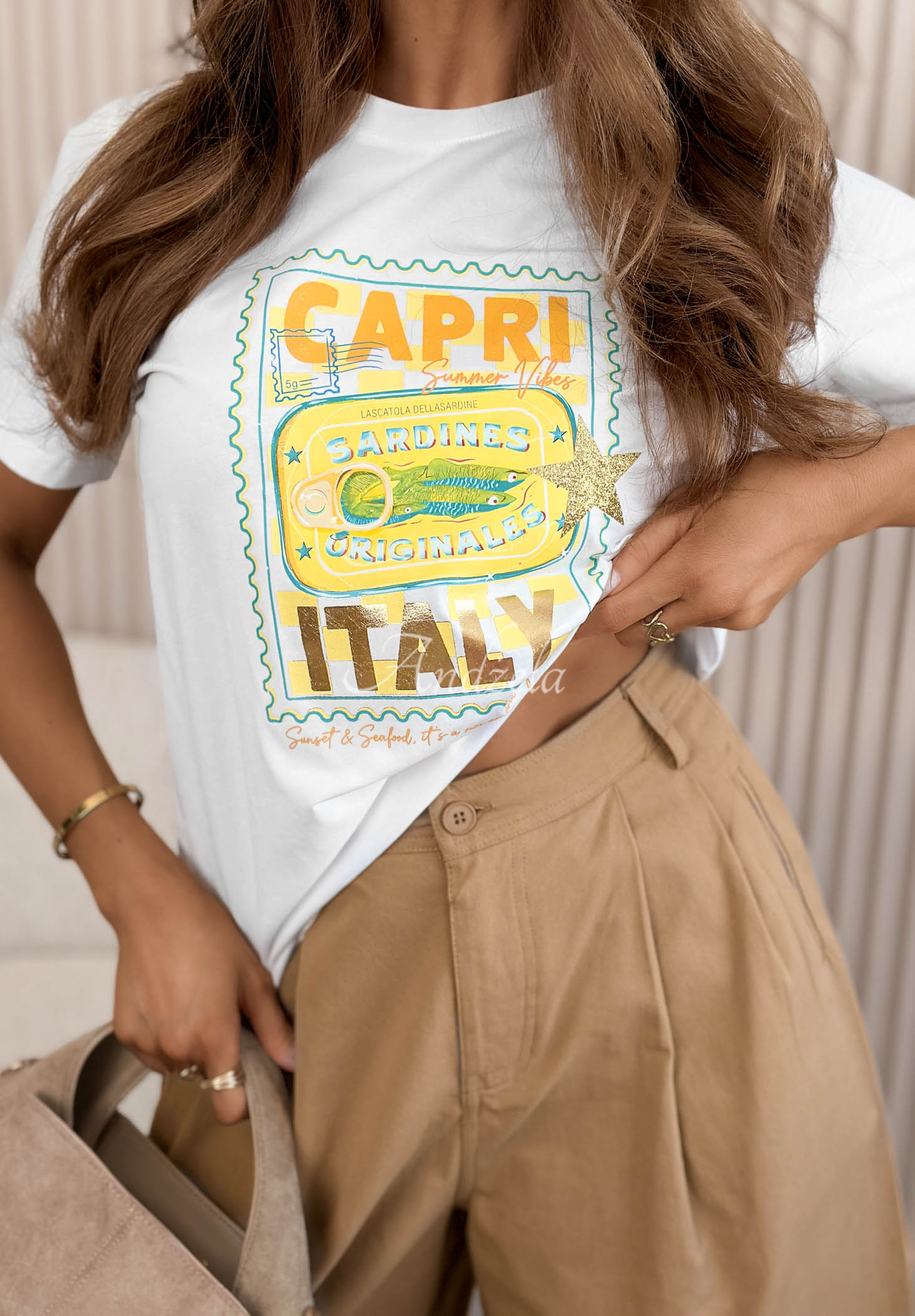 Modelul are înălțimea de 165 cm și poartă mărimea S/M.